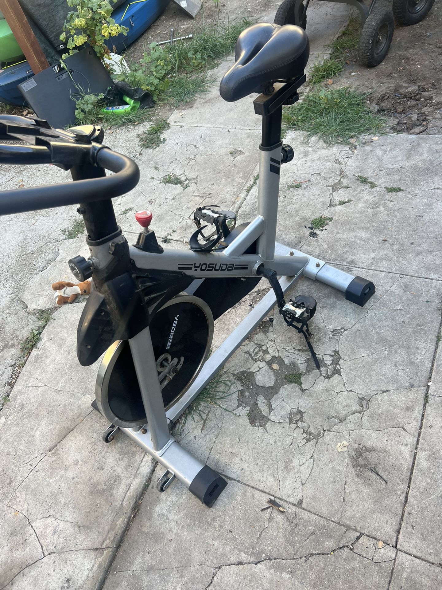 Sturdy indoor exercise bike. Has adjustable seat and handlebars for comfy ride. Comes with pedals with straps and a water bottle holder. Has a resistance knob too. Great for home workouts.