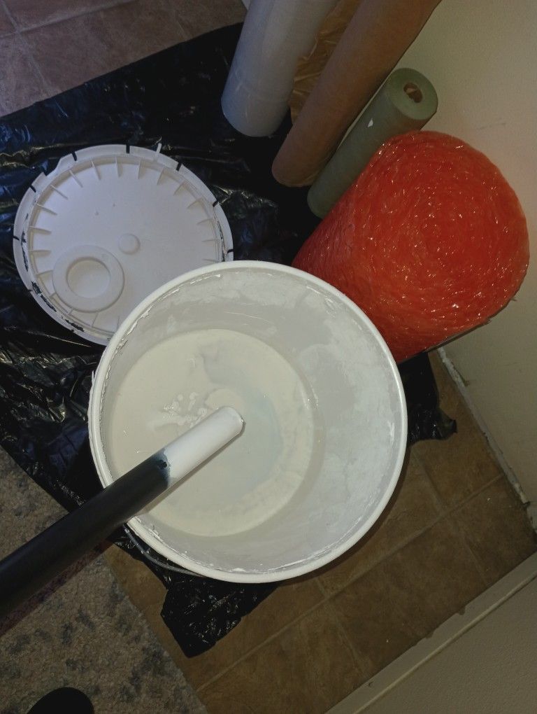 A quarter of a half bucket of all white paint I got dropped towel Saran wrap bubble wrap everything you need for a painting job