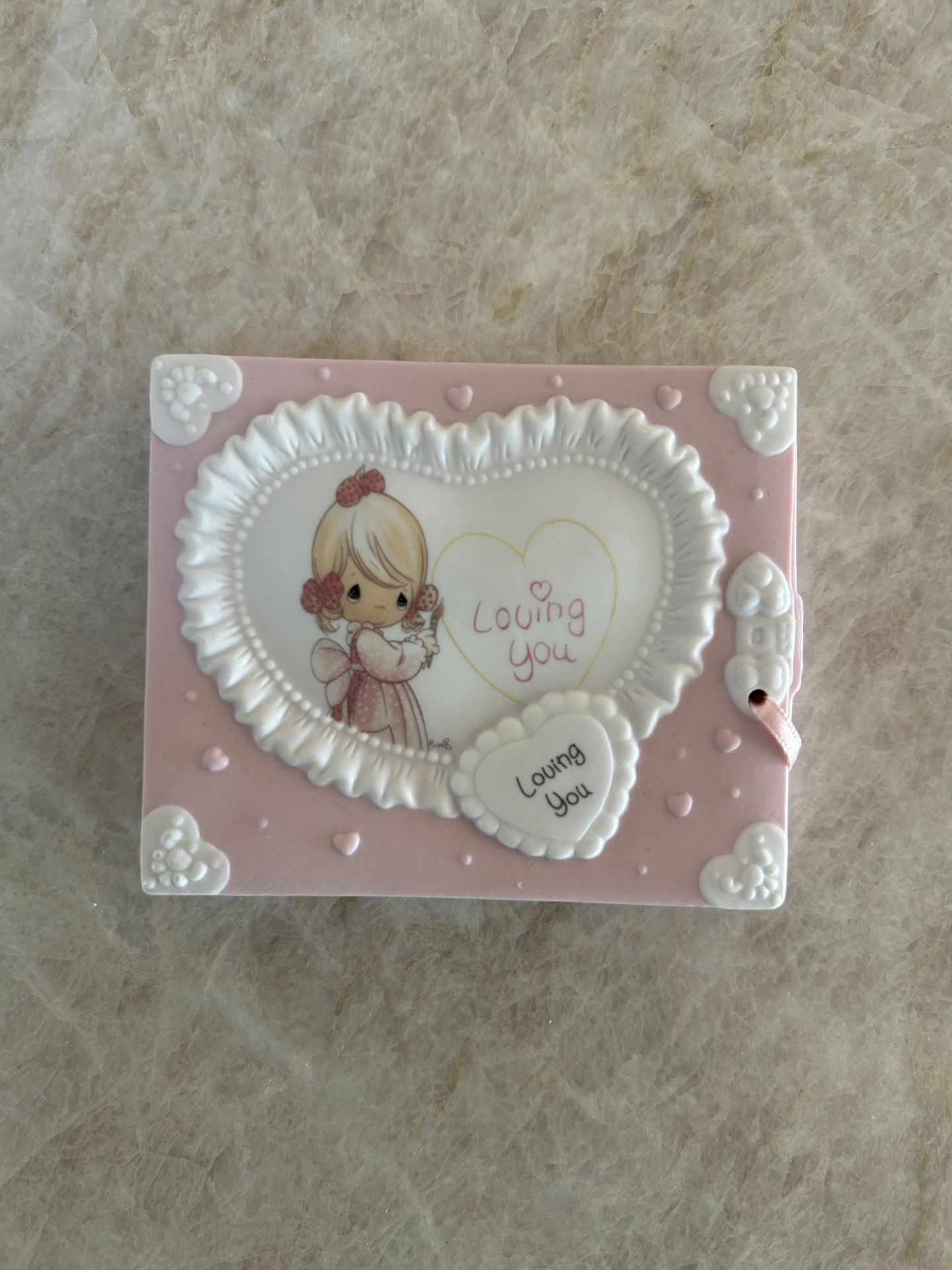 Enesco 1994 Precious Moments. Love and Friendship pink porcelain covered box. #101788. Girl with big heart. Measures 4”L, 3”W, 1”H. In perfect condition. In original box w/certificate. From smoke free home.