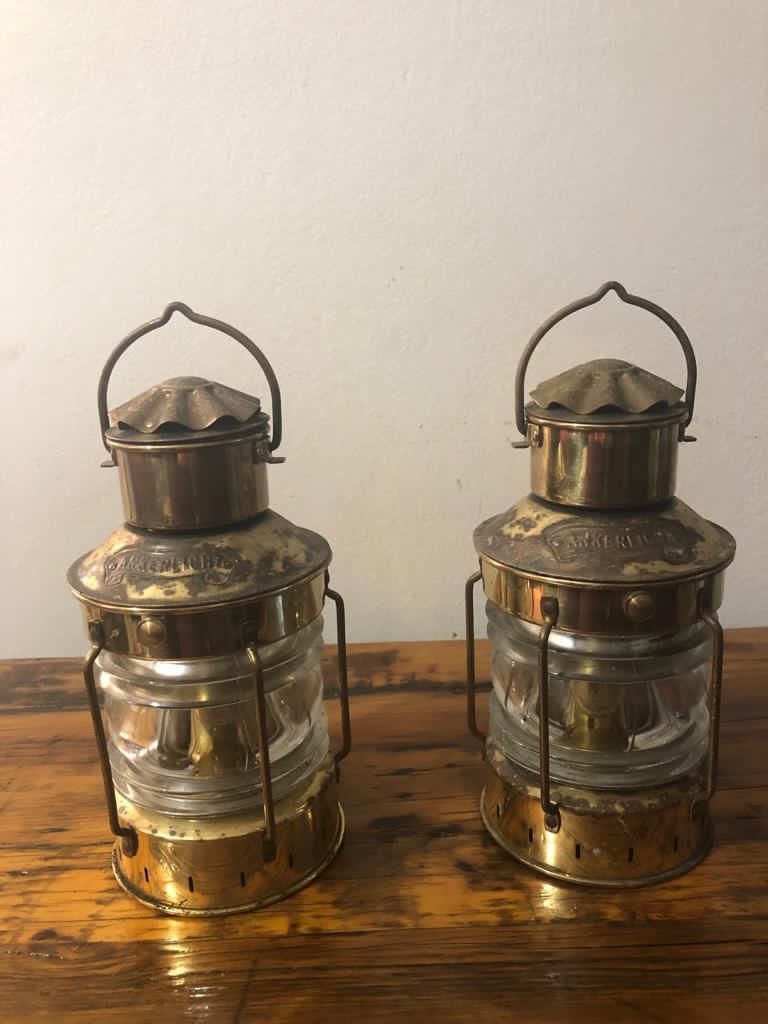 PAREJA DE FAROLES DE BARCO MUY ANTIGUO DE BRONCE Y CRITAL GRUESO