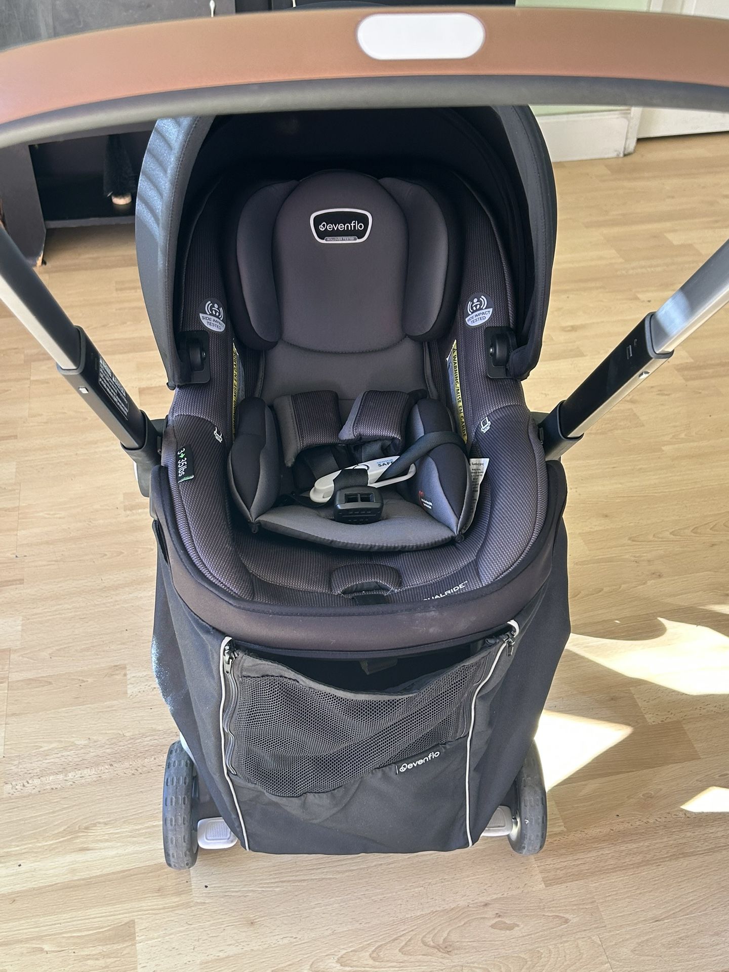 Evenflo car seat stroller in good condition can detach from wheels has a safety app easy to put in and out of the car without having to fold stroller come with bag and cup holder