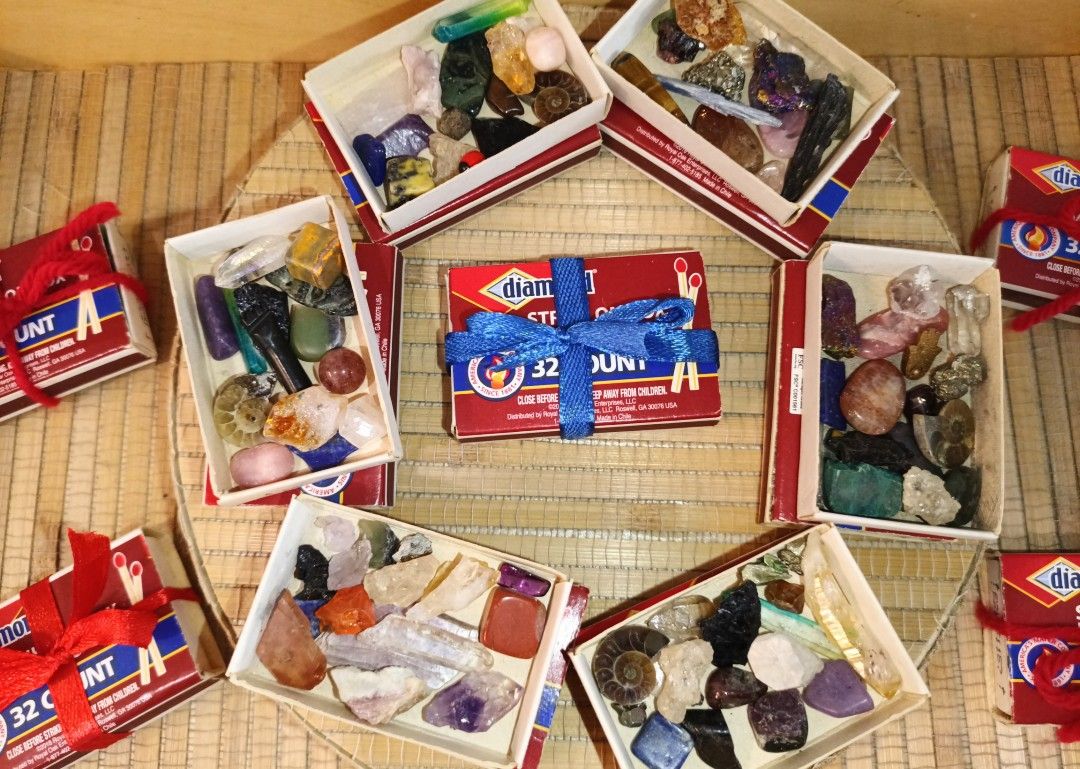 11 Matchbooks w Miniature Crystals $44 Each Call or text me to pick them up If you pay by Zelle I can include shipping and send them to you in the mail. 16 different crystals per matchbook Some rare crystals / stones Fun inspiration I had to make these. Keep them in your pocket or On your desk Perfect stocking suffer for Christmas