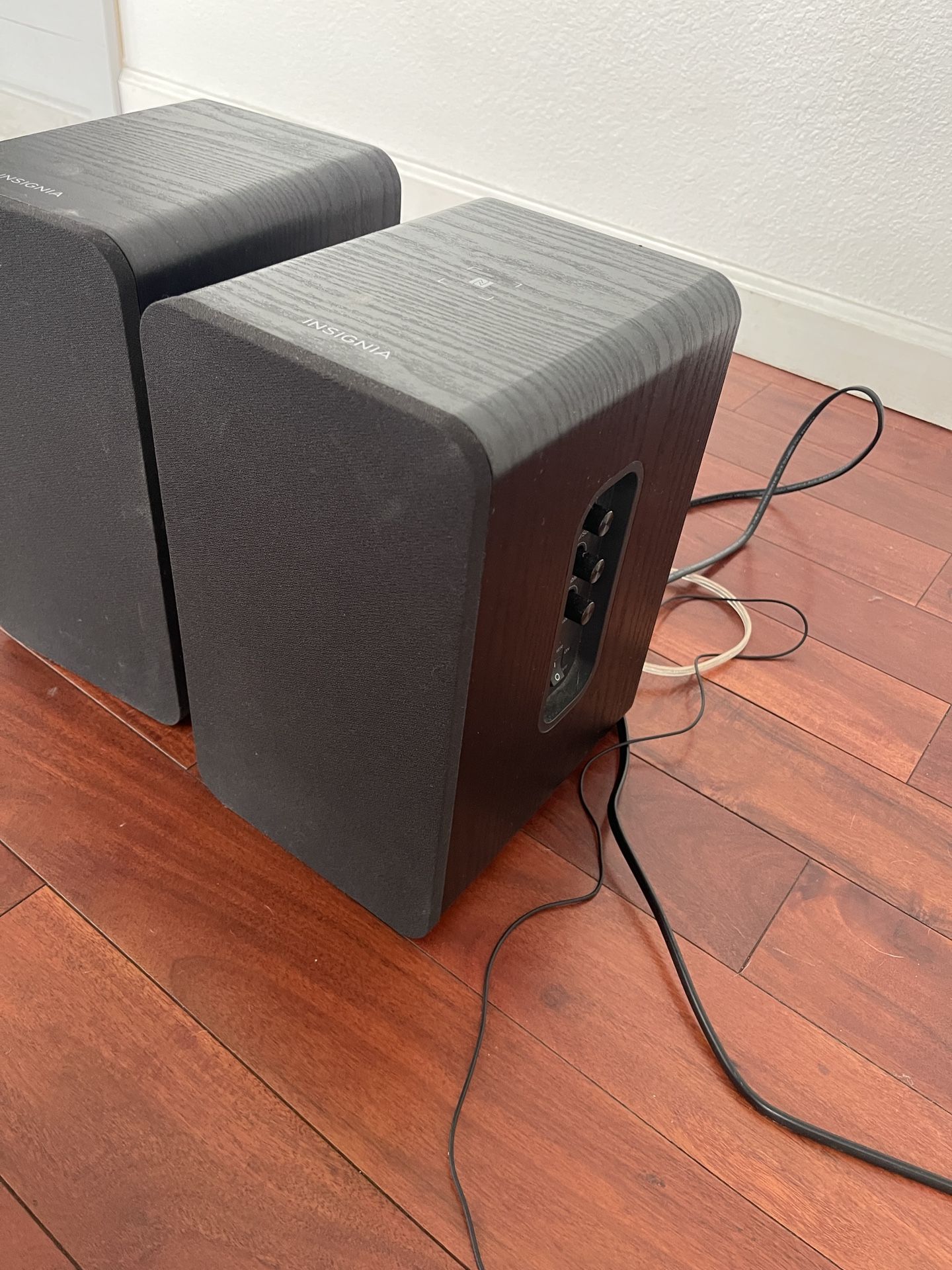 Great working speakers! Sounds amazing! The wood finish gives it a nice, clean look. Bluetooth and auxiliary works great. Comes with power cable. Connecting cables for L/R speakers. Auxiliary cable (I recommend getting a better aux cable because the one it came with feels cheap). Base/treble controls.