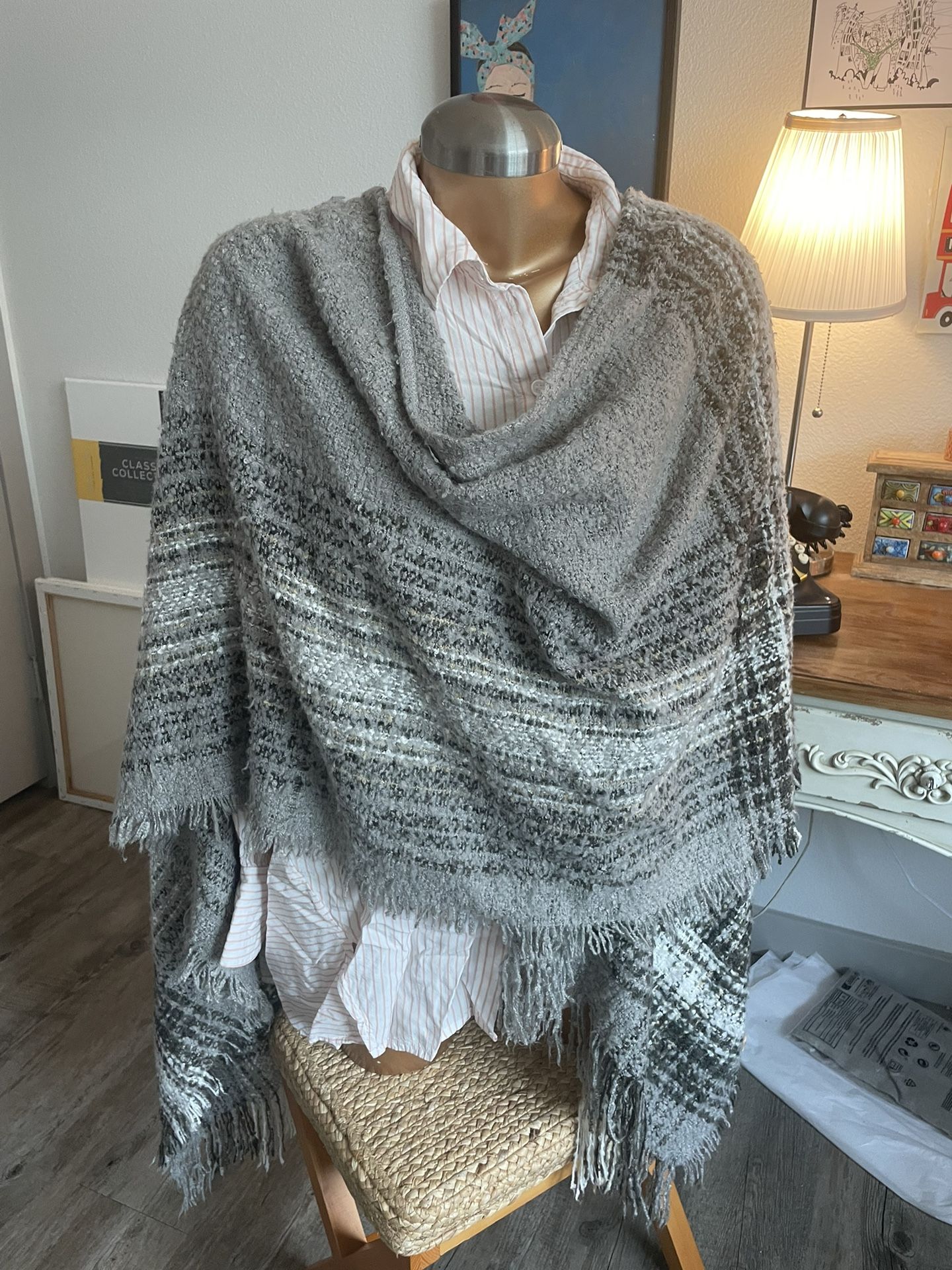 Beautiful brand new winter pashmina in a soft gray tone. Cozy, warm, and elegant, perfect for colder days. Features a lovely textured weave with subtle pattern details and delicate fringe edges. Very versatile, easy to style over sweaters, coats, or dresses. One size fits all. Brand new, never worn. Price $11