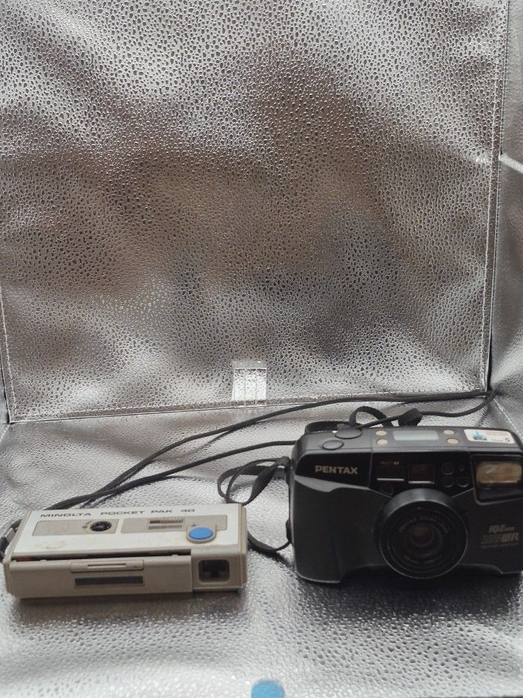 Two vintage film cameras. The first is a minolta PAK 40 ,110 FILM CAMERA. The second is a Pentax 1Q zoom 105 WR 35mm camera. Neither camera has been tested sold as is