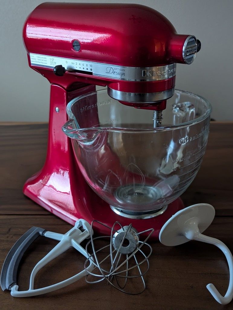KitchenAid Artisan Design Series 5 qt Tilt Head Stand Mixer with a 5 qt glass bowl, whisk, dough hook, and a flat beater. It works great.