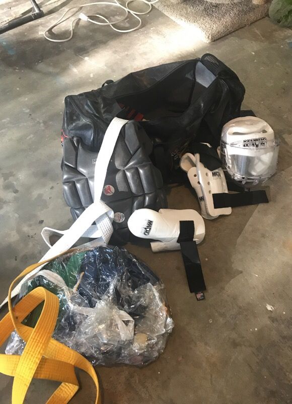 Karate outfits size 1, with belts and sparring equipment, plus the super cool duffel bag.
