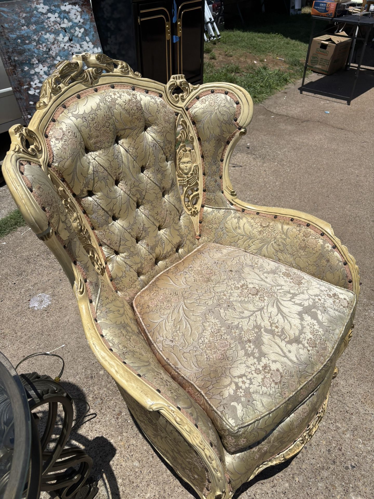 This chair is in good conditions no damages other than I believe it might be stained and is noticeable but sort of camouflages with the chair at the same time . Delivery will be offered at an extra cost . Silla está en buenas condiciones solo creo está manchada y es notable aunque hace camuflaje con el estilo de la silla . Ofrezco entrega a un costo adicional dependiendo la distancia .