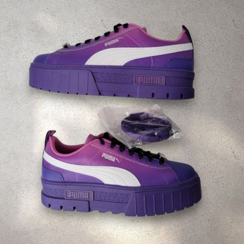Bratz x Puma platform sneakers. The PUMA x BRATZ collab transforms the Mayze silhouette with an eye-catching gradient upper, sleek co-branding, and jewel details – perfect for the most daring trend enthusiasts. New never worn just been on a shelf. Got a bit dusty from sitting for yrs. Also some flaws shown (glue maybe idk?) On the bottom. Some flaws shown on the side of the shoe in last pic. Nothing major, still in rlly good shape. Size 6.5 youth so 8 in women's. Sold out not available anymore. 2021 collab. Tags: purple pink white pumas shoes rare 144 60!!
