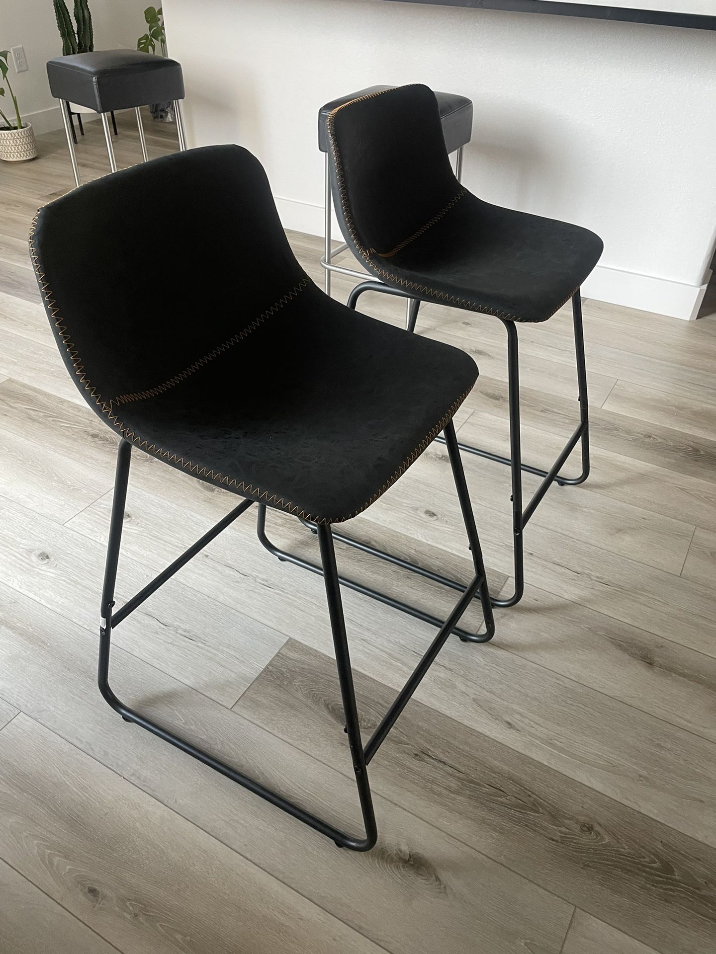 2 24” seat height bar stools. With Matte textured leather(see photo) and brown stitching. Brand new; would like a taller bar stool. Purchased from Home Depot online. $130