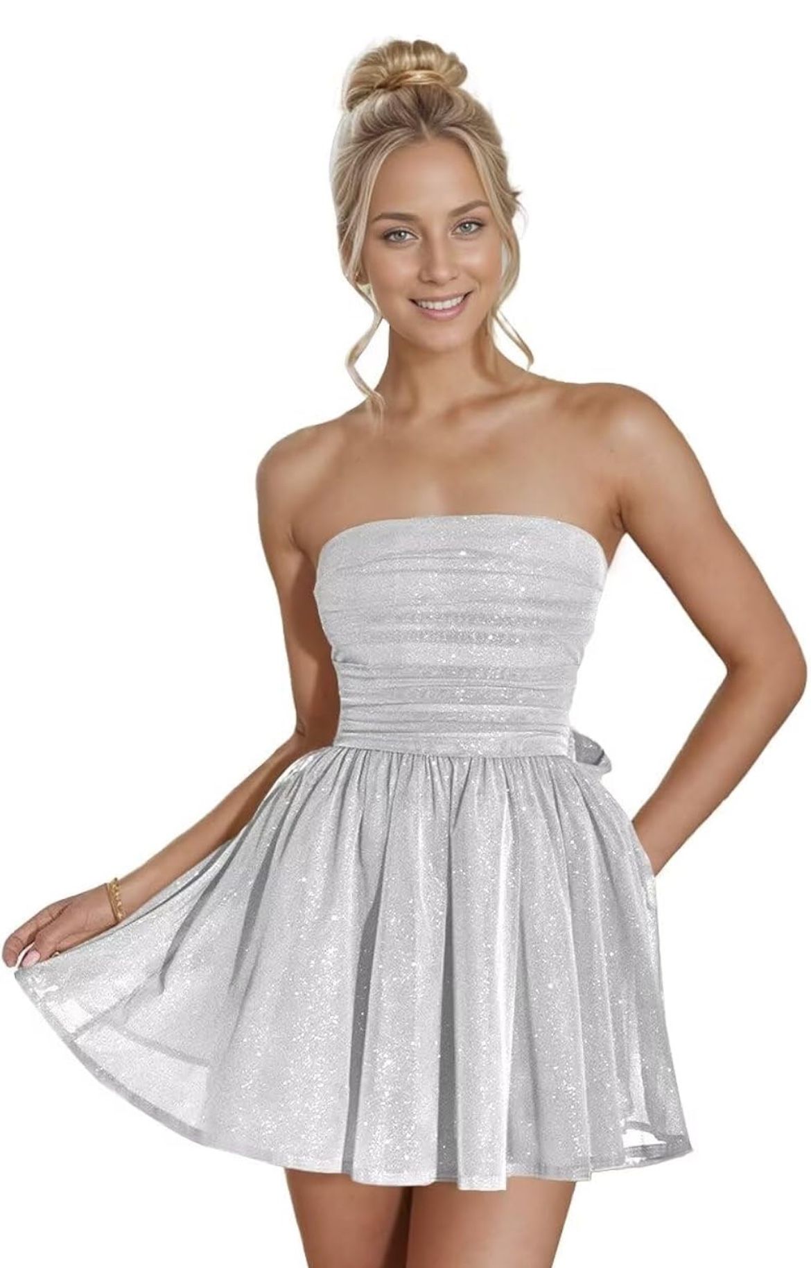Silver Sparkly Strapless Short Evening, Mini Cocktail Dress w/Bow, Size 10 *NEW*