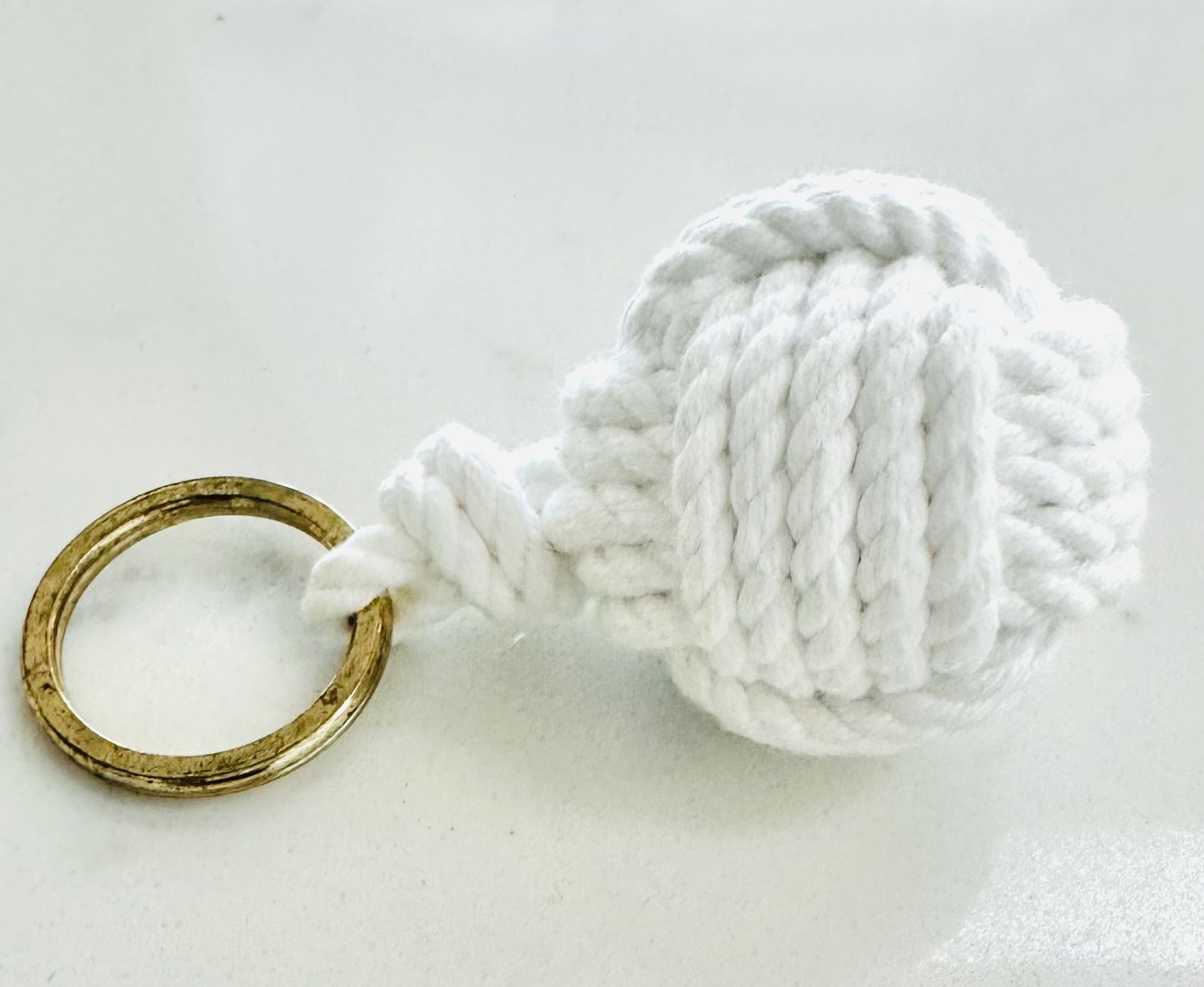 Nautical Monkey-Fist Knot Keychain, White Cotton Rope with Rustic Brass Ring