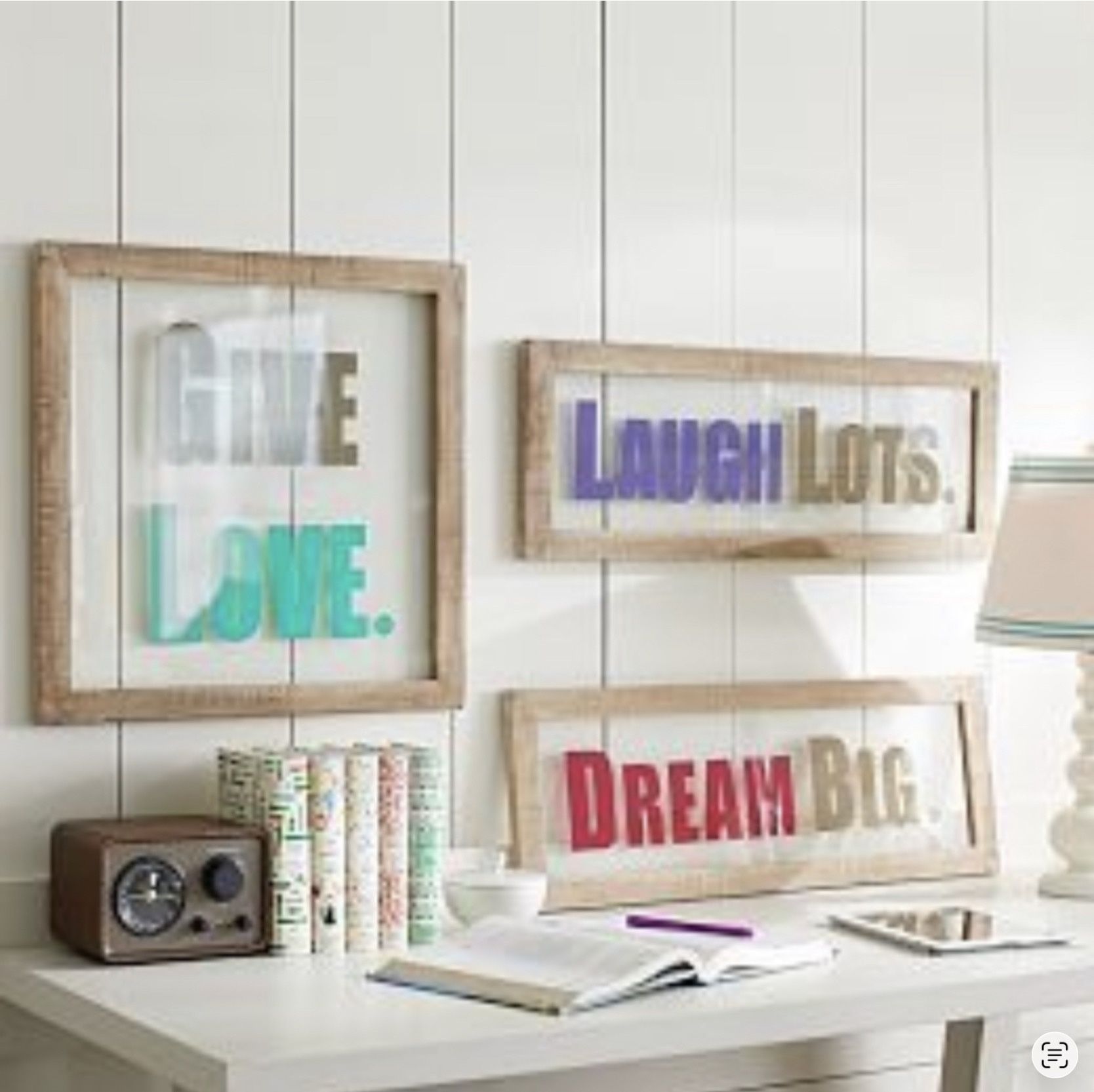 Beautiful Pottery Barn Teen framed wall art set featuring the phrases: • GIVE LOVE. (20” x 20”) • DREAM BIG. (28” x 10”) • LAUGH LOTS. (28” x 10”) All three pieces have matching rustic wood frames with colorful lettering. In great condition — no cracks or damage. Perfect for a nursery, kids’ room, teen bedroom, or playroom. Originally purchased from Pottery Barn Teen. Selling as a coordinated set — looks great hung together or spread throughout a room. Smoke-free home. Local pickup only. May consider selling individually for $35 each.