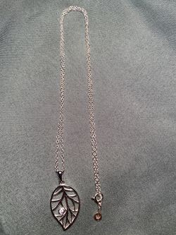 Hallmark brand 18 inch sterling silver chain (925 China) with an open pattern leaf design charm (925 China) that has a single cubic zirconia accent. Could use a polishing.