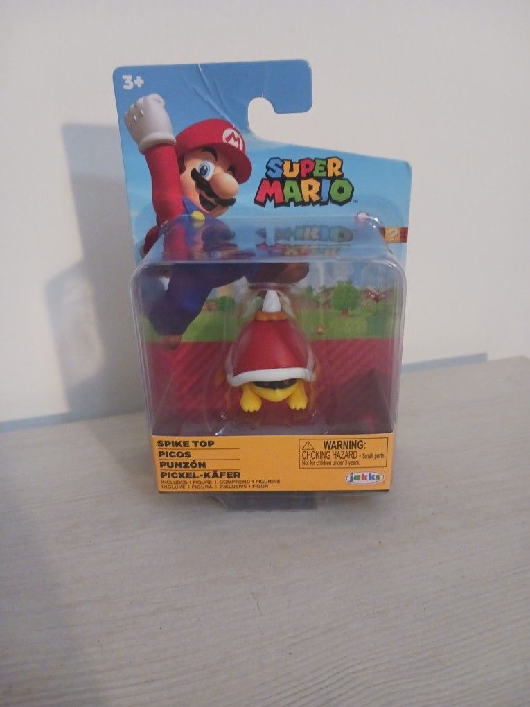 This product is a 2.5 inch Super Mario Spike Top action figure manufactured by JAKKS Pacific. It is a new, original, and licensed reproduction in its original packaging that has never been opened. The figure is made of plastic and represents the character Spike Top from the Super Mario Bros. franchise. It is recommended for ages 3 and up and was manufactured in 2021. The item height is 2.5 inches and it belongs to the TV, Movie & Video Games theme.