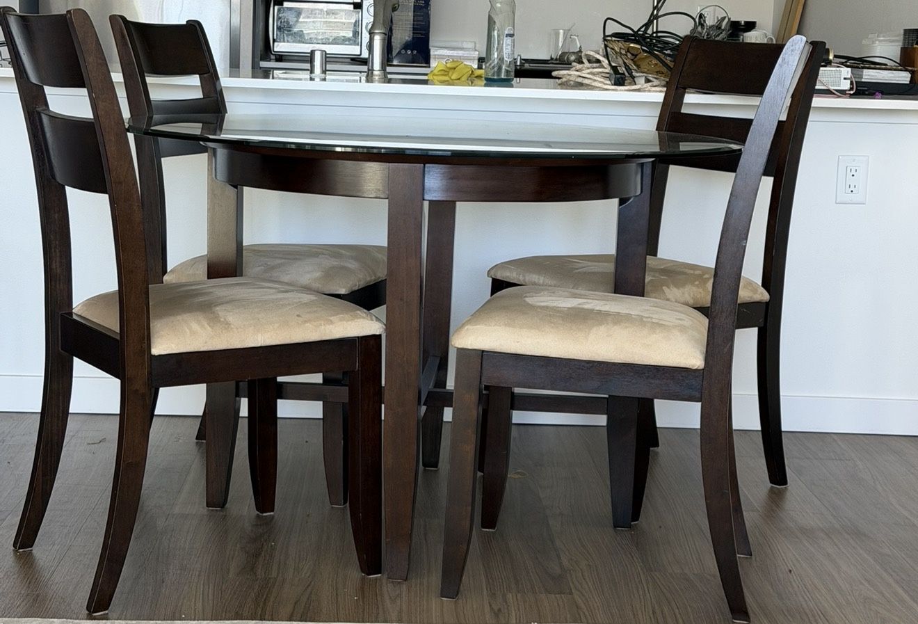 Round glass dining table with four chairs in excellent condition. Very clean, no damage, and gently used. Ready for immediate pickup.