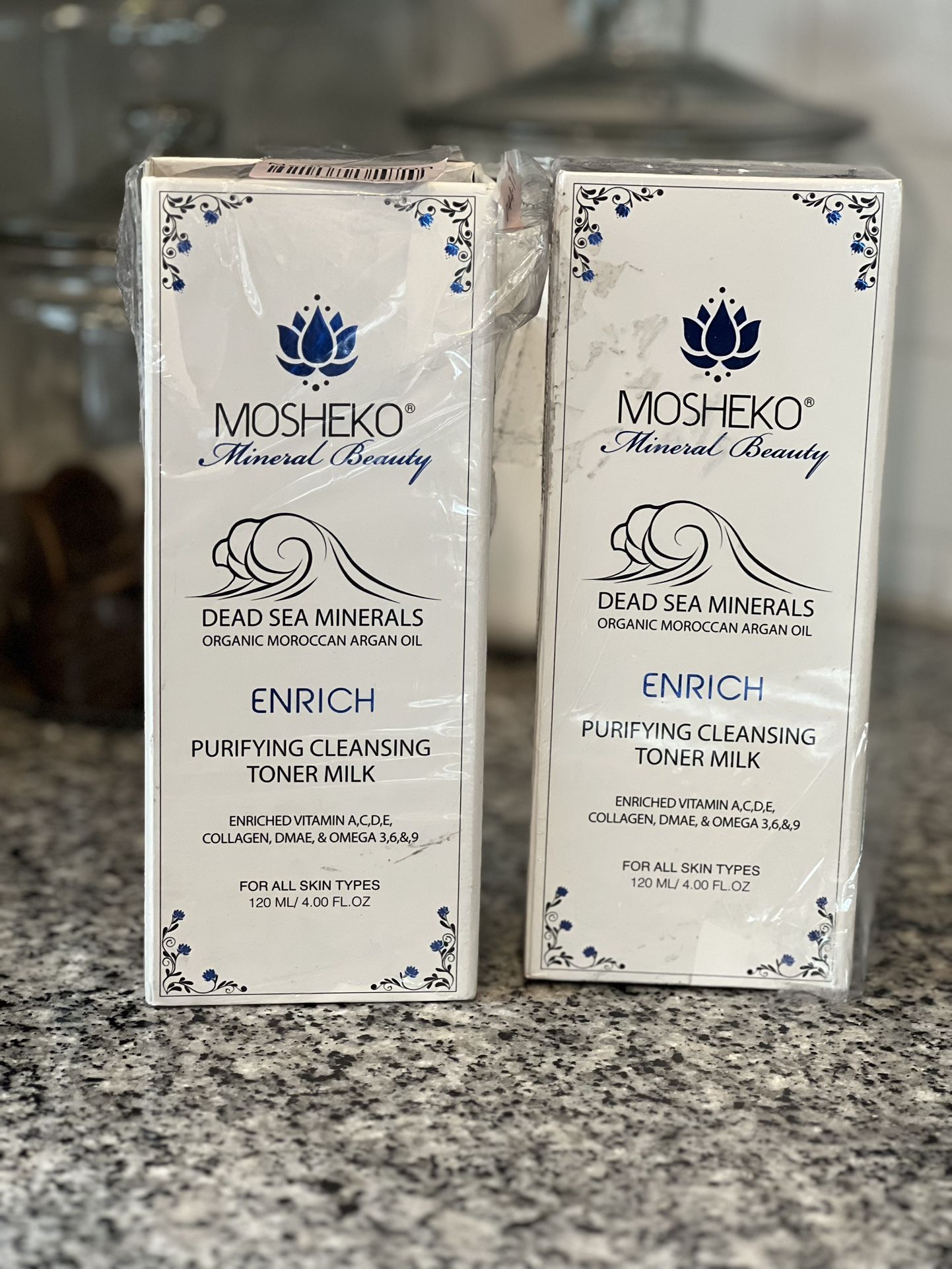New in box with plastic seal still on it. Mosheko Mineral Beauty Dead Sea Minerals “Enrich” Purifying Cleansing Toner Milk Enriched with vitamins A C D E, collagen DMAE, and Omega 3,6, & 9 For all skin types. MSRP: $129.99. Selling for $25 each