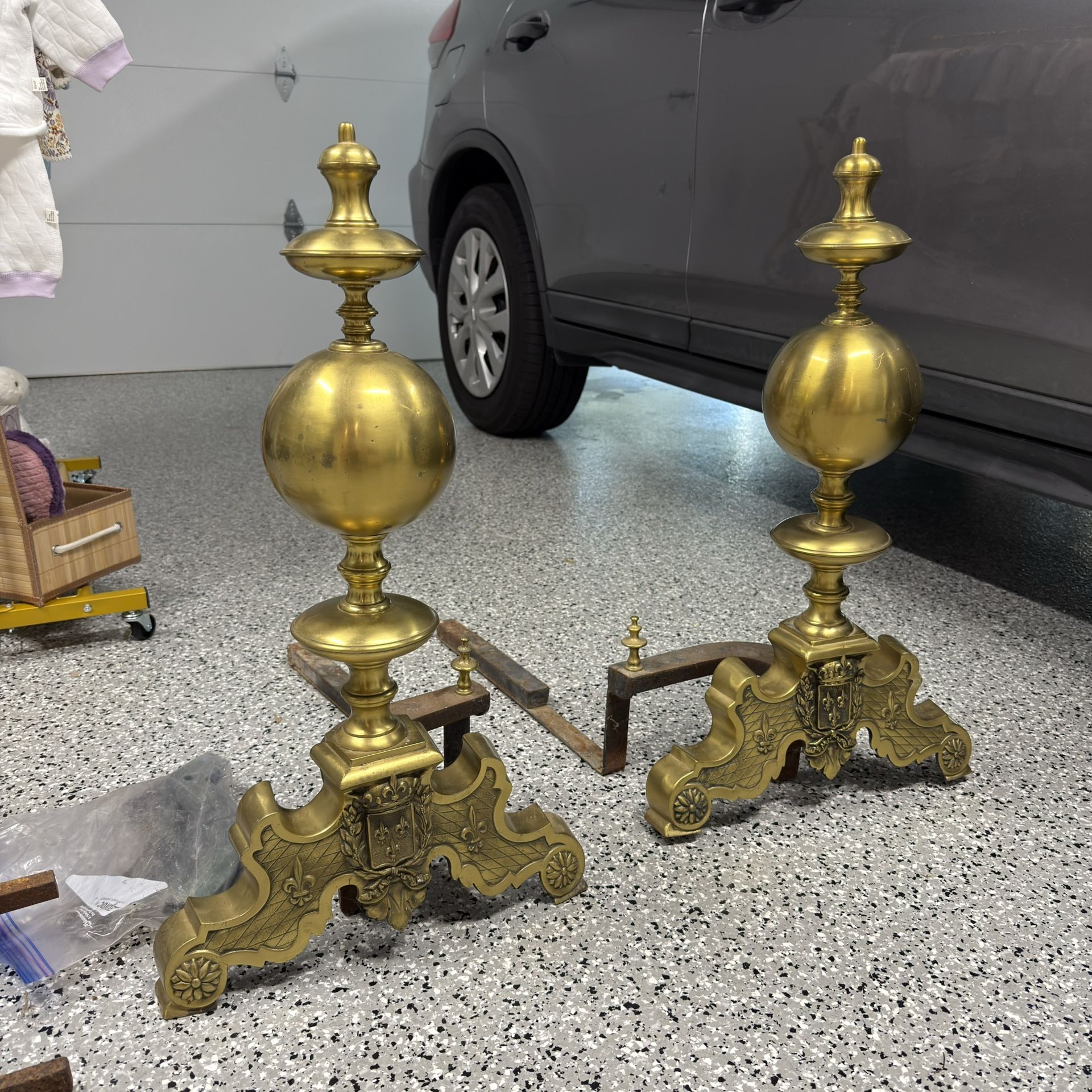 For sale: Brass Andirons. These are originally from a house in Montecito. French fleur-de-lis pattern.