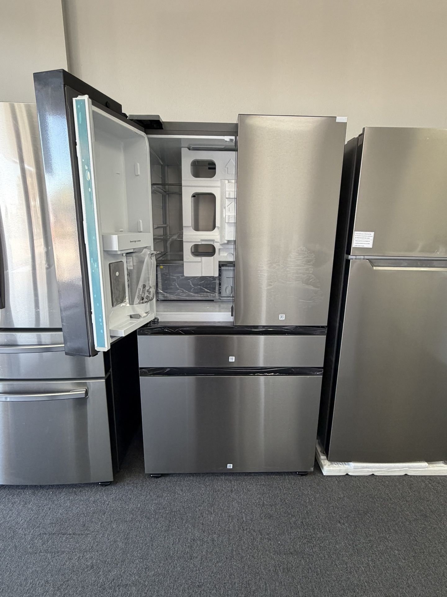 Refrigerador stainless steel new water dispenser and ice maker We stock washers, dryers, stoves, cooktops, refrigerators, dishwashers and microwaves. Samsung LG Frigidaire Whirlpool Kitchenaid GE Maytag and Bosch We carry new open box, used and scratch and dent appliances 1 year warranty new open box appliances delivery and installation available.