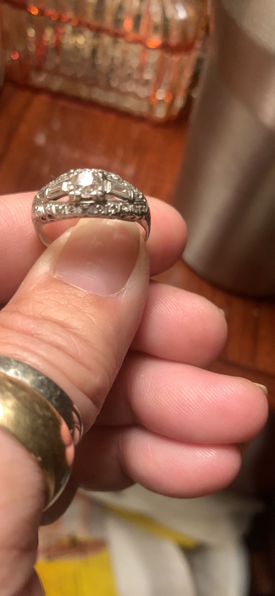 Miner cut diamond center stone, two baguettes and 20 small diamonds. Band has no stones. Is also platinum. Appraised over $2000