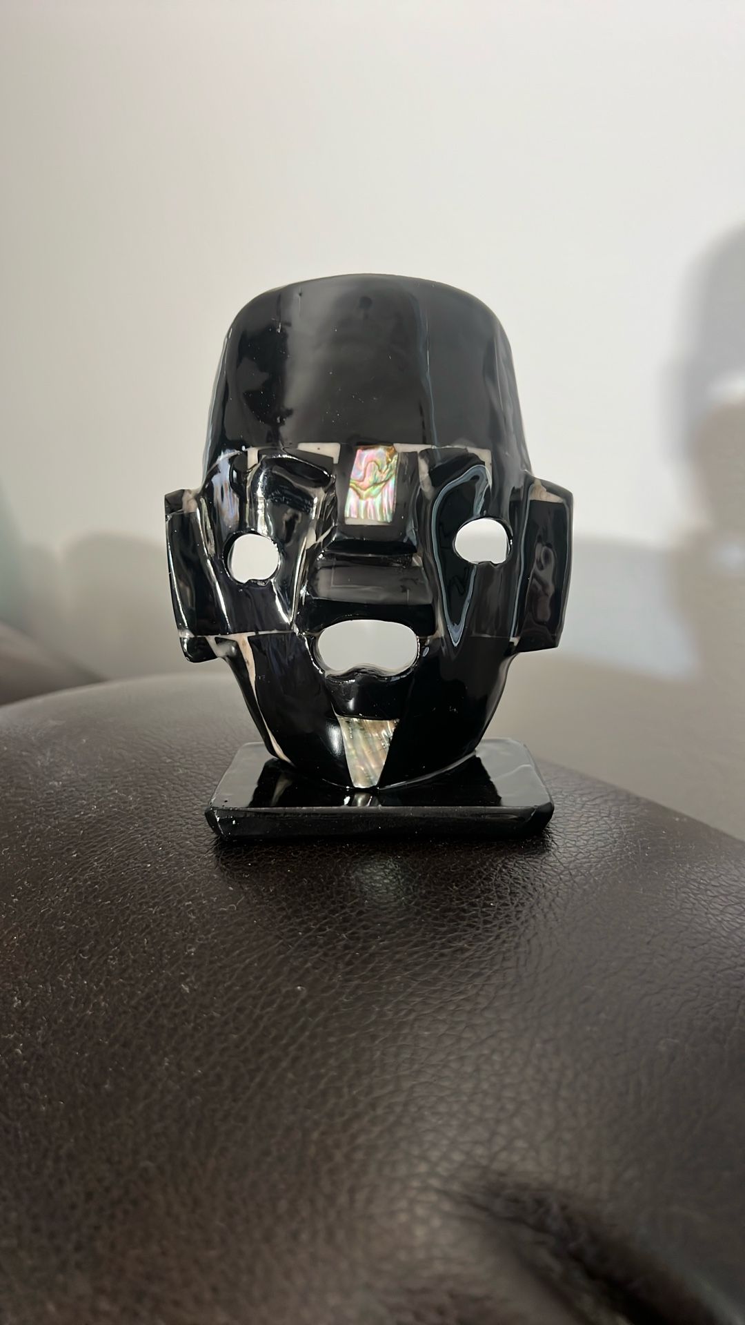 Decorative Mayan or Aztec-style death mask sculpture. These are modern folk art pieces made by local artisans in Mexico, often replicating ancient burial masks. The mask is typically made from black stone, such as obsidian or onyx, with mosaic inlays of abalone shell and semi-precious stones. Size: 4.5 x 4 inches