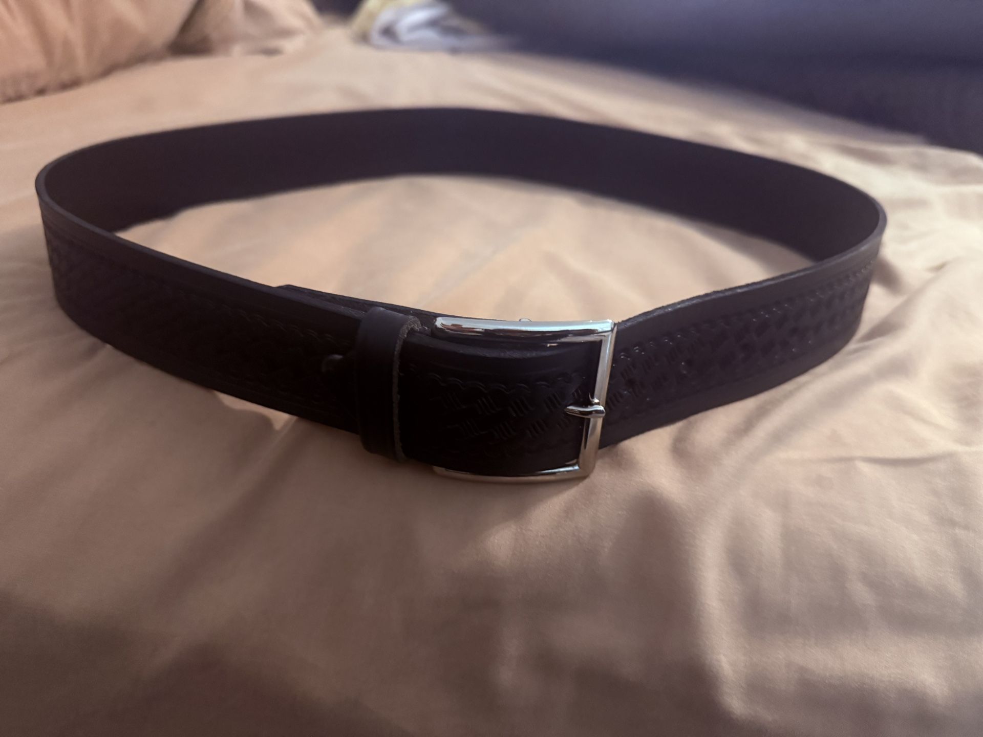 Selling a 40 inch black Bandera leather belt. Brand new. Wore it once and didn’t like it. It’s too wide for me. It’s 1.75 inches wide and 43.5 inches long from tip to buckle. Only asking $5 or best offer for it. Just make me an offer close and it’s yours. Please let me know if u are interested or have questions. Thank u.