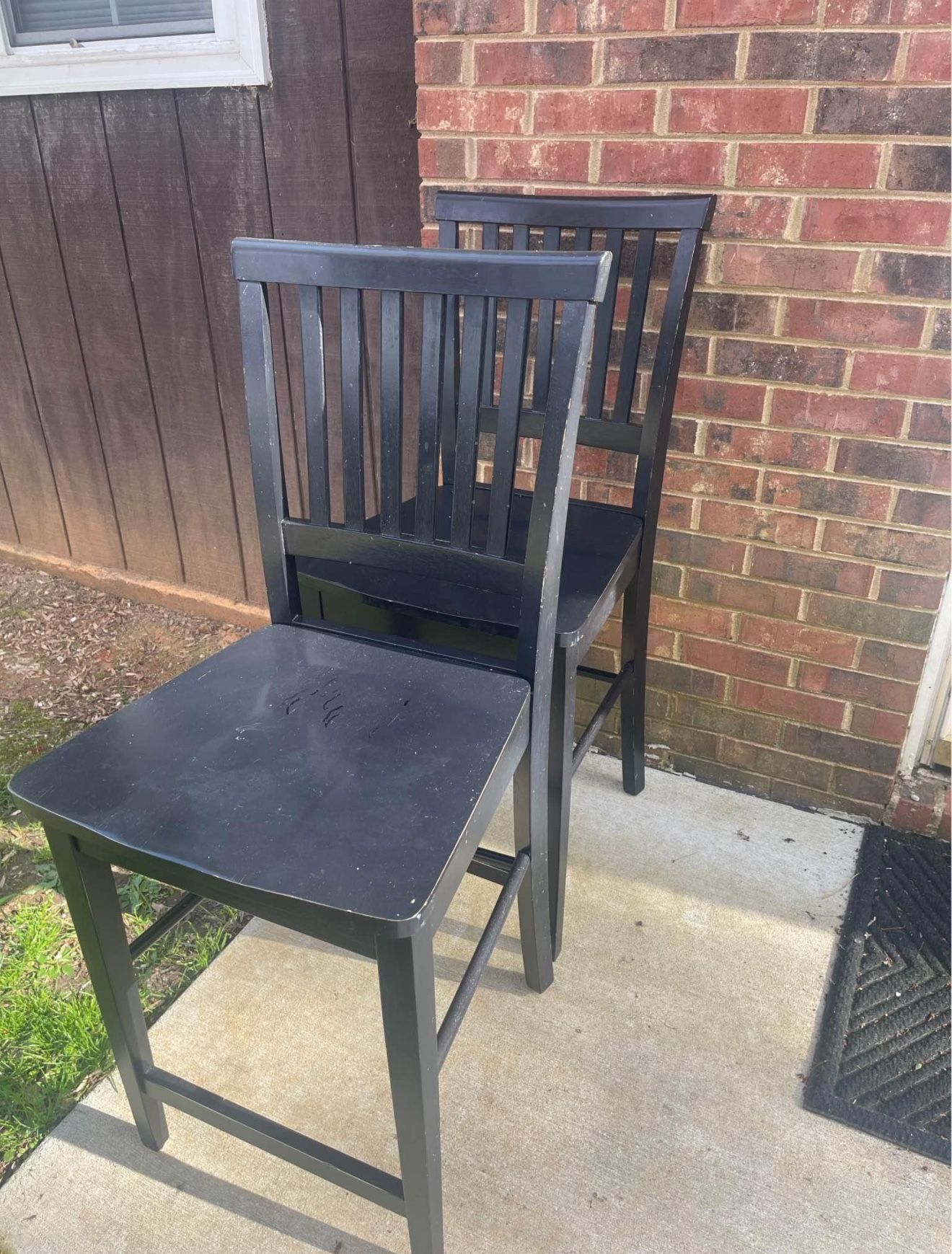 Could use a good wipe down! Some touch ups may be needed as well. Very sturdy black wooden bar stools 24” floor to seat, 41” floor to top of back of chair