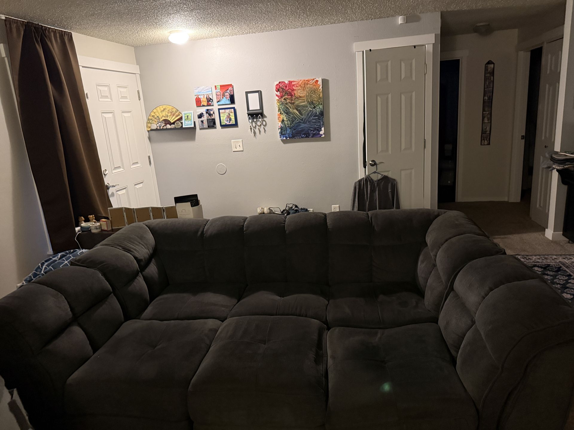 This is a great sectional sofa/bed for guests. I needed a larger sofa for my space. This couch is comfortable, clean, and from a smoke-free home. The back piece is one couch, each side piece and ottoman are able to be moved and connected in different shapes depending on your preference. When it is together, like in the picture, it is a full-sized bed.