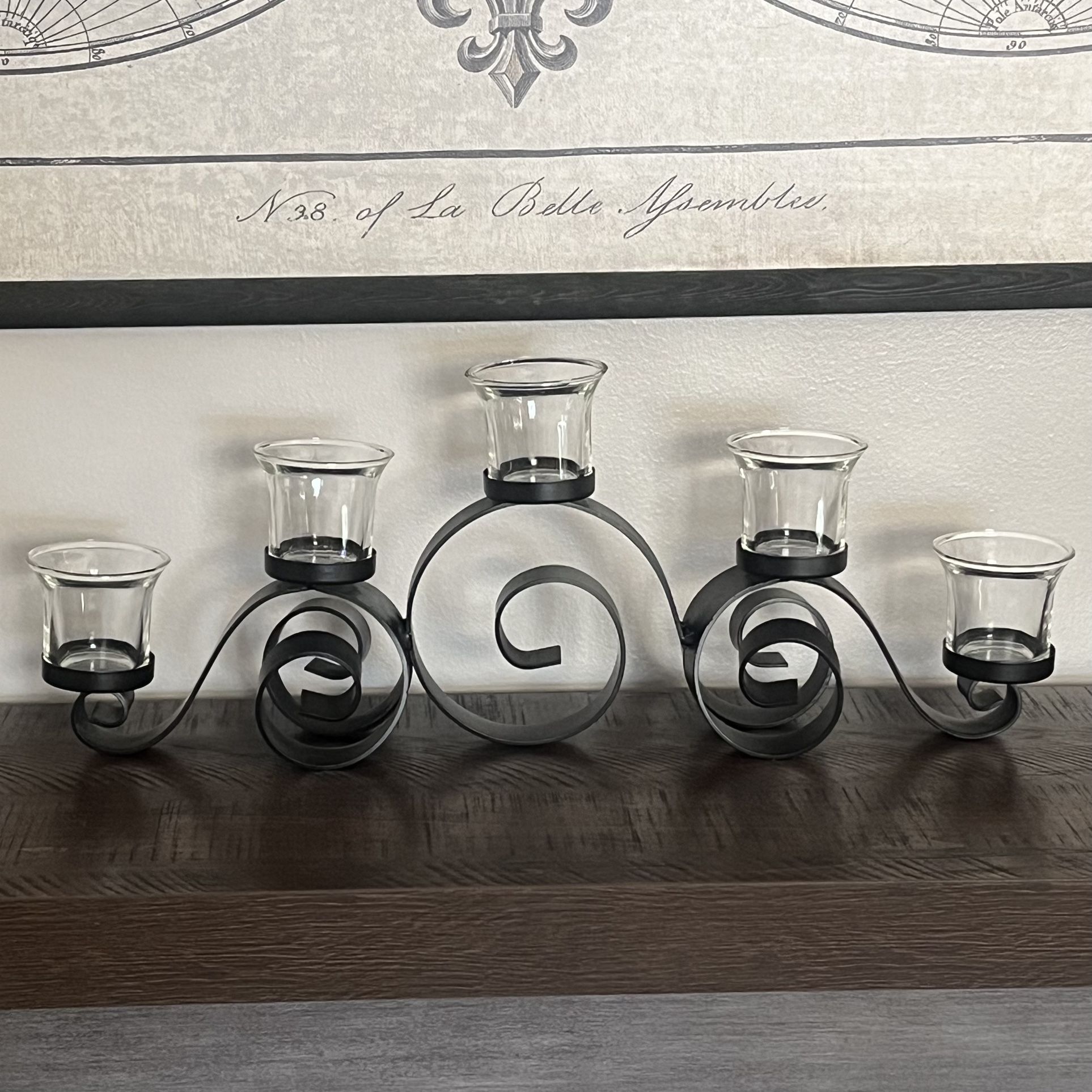 Large decorative 5 votive candle holder Measures 8” tall x 21” wide Large and heavy Satin black finished metal In like-new condition Makes a great table centerpiece Candles not included Comes from a non-smoking home Cash only please Pickup at my home on Vicksburg Drive in Parma (No shipping available)