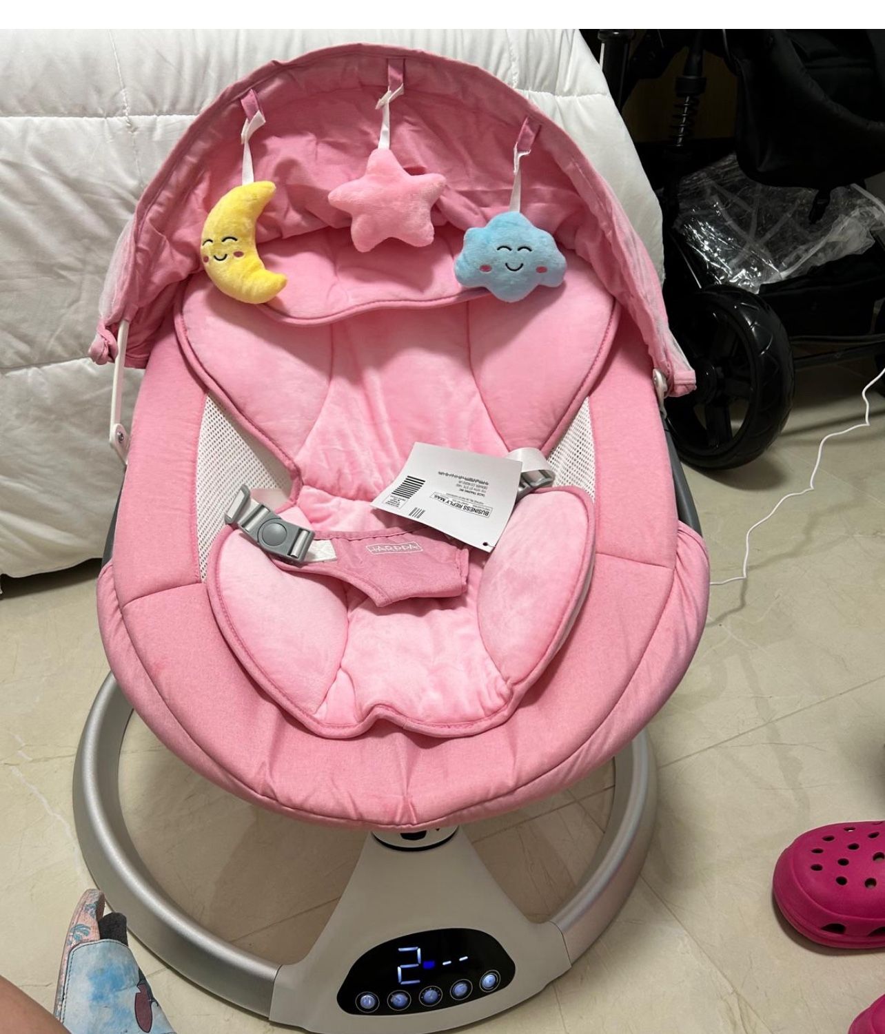 Adjustable swing speeds, Portable, Nature sounds, Music, Timer, Washable cover