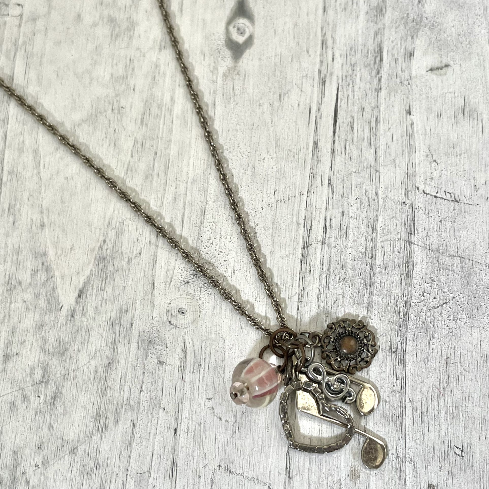 Long necklace Charms - 2 musical notes, rhinestone heart, pink bead and circle Lobster clasp with extender EUC Always open to reasonable offers Fast shipping Smoke and pet free home Bundle to save (the more you buy the bigger the discount ) Please see photos for details (they are part of the description) Thanks for stopping by!