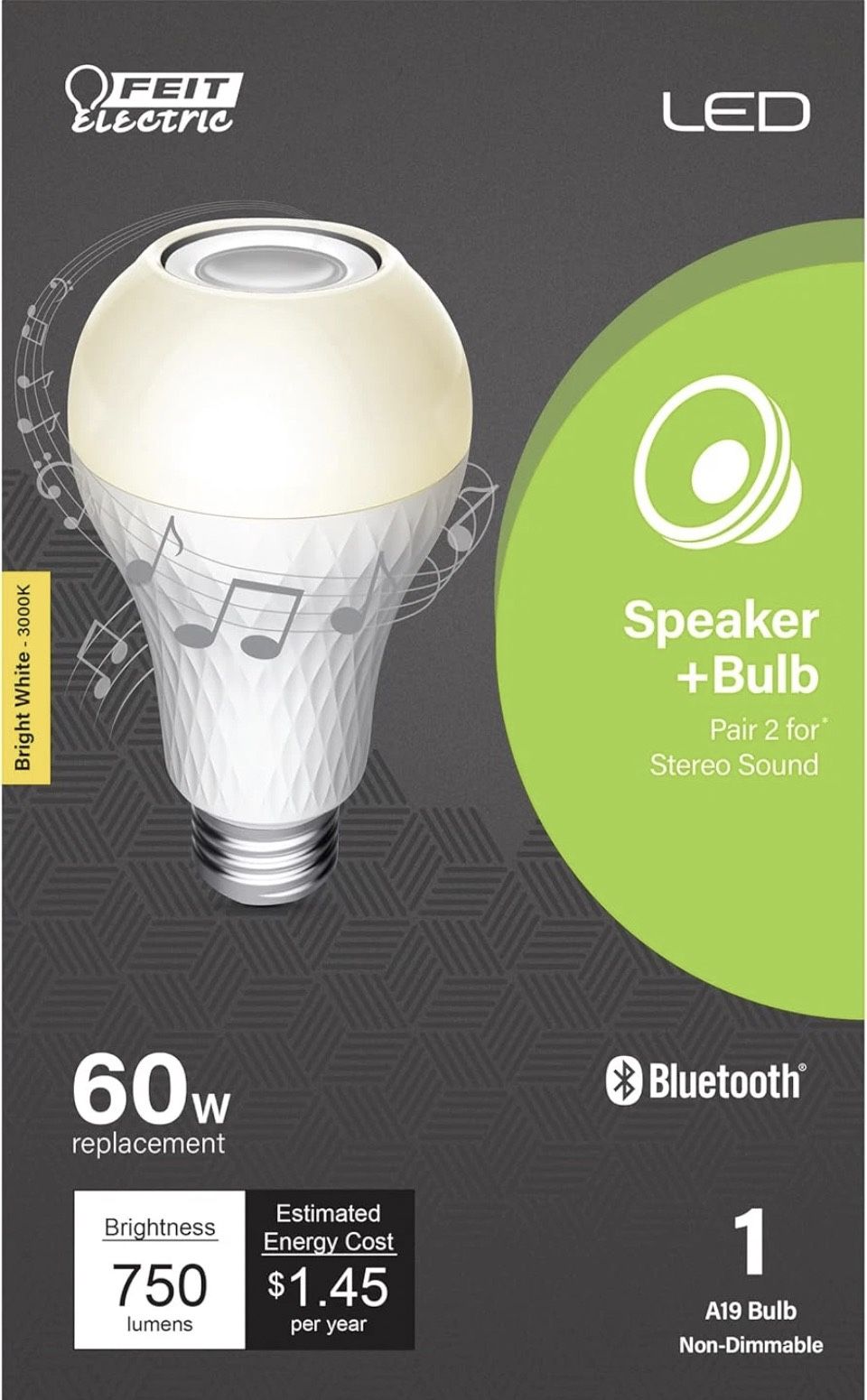 Features: BUILT-IN SPEAKER: Keep your home well-lit and musical; this unique bulb combines integrated Bright White light with a Bluetooth speaker that easily connects to your favorite device up to 30ft away and pairs with up to two bulbs for the ultimate surround sound. FEIT ELECTRIC BRIGHT WHITE LIGHT BULBS: This 3000K color temperature produces a comfortable, yellowish, and calm glow; the most popular choice for homes; widely used for living room, bedroom, bathroom, lobby and hallway. ENERGY SAVING: Feit Electric LED A19 Light bulb provides up to 80% energy saving by replacing 60W with 12W; replace your old incandescent bulbs for a brighter and more energy-friendly home. LONG LASTING LED TECHNOLOGY: Lasting 10 times longer than incandescent and halogen bulbs with a lifespan of up to 10 years, eliminating the need to constantly change your light bulbs. INSTANT ON TO FULL BRIGHTNESS: No warm-up time for this bulb; they will light up instantly with its full brightness of 750 Lumens with stable bright white color. QUALITY and SAFETY: UL listed and FCC compliant, Feit Electric upholds the highest standards for all our light bulbs, fixtures and string lights with optimal performance and safety; with 40+ years of experience in lighting, we are the leader in lighting innovations A YEAR WARRANTY: Backed by a 1-year warranty, you can trust the quality and reliability of our LED Speaker Light Bulb to enhance your home audio and lighting experience.