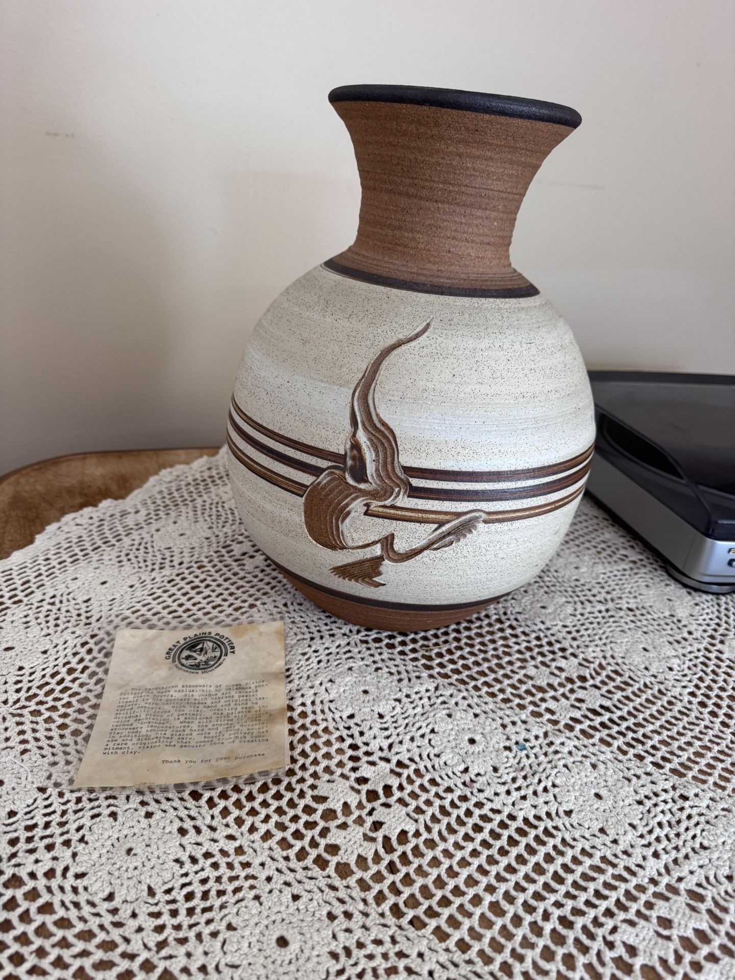 Beautiful vintage hand-thrown stoneware vase by Great Plains Pottery, made in Oklahoma by potter Steve Rogers. This piece features an earthy, natural color palette with hand-applied slip (engobe) decoration and a sculptural form. The vase is signed on the bottom and comes with the original Great Plains Pottery information card, confirming authenticity. Details: • Hand-thrown stoneware • Signed by the artist (Rogers) • Made in Oklahoma, USA • Approx. height: ~13.5 inches • Approx. width: ~10 inches • Opening diameter: ~6 inches • Excellent vintage condition, no cracks or repairs • Decorative / collectible art pottery A beautiful statement piece for collectors of studio pottery, vintage decor, or Southwestern / earthy interiors