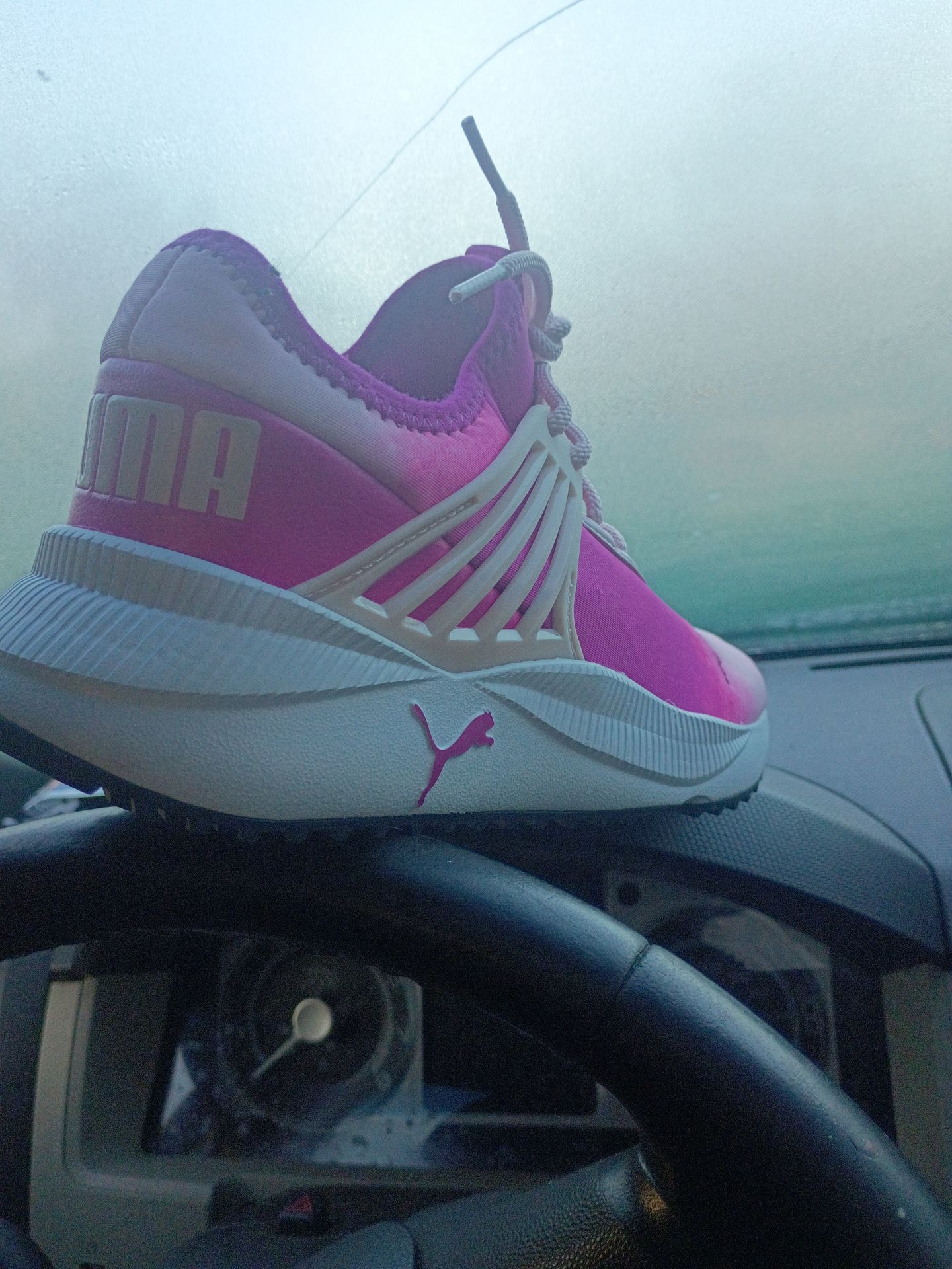 These are Puma Kids Pacer Future GS Sneakers in the Magenta Gleam / Muaved Out / Alpine Snow Colorway size 6c Gently Used.