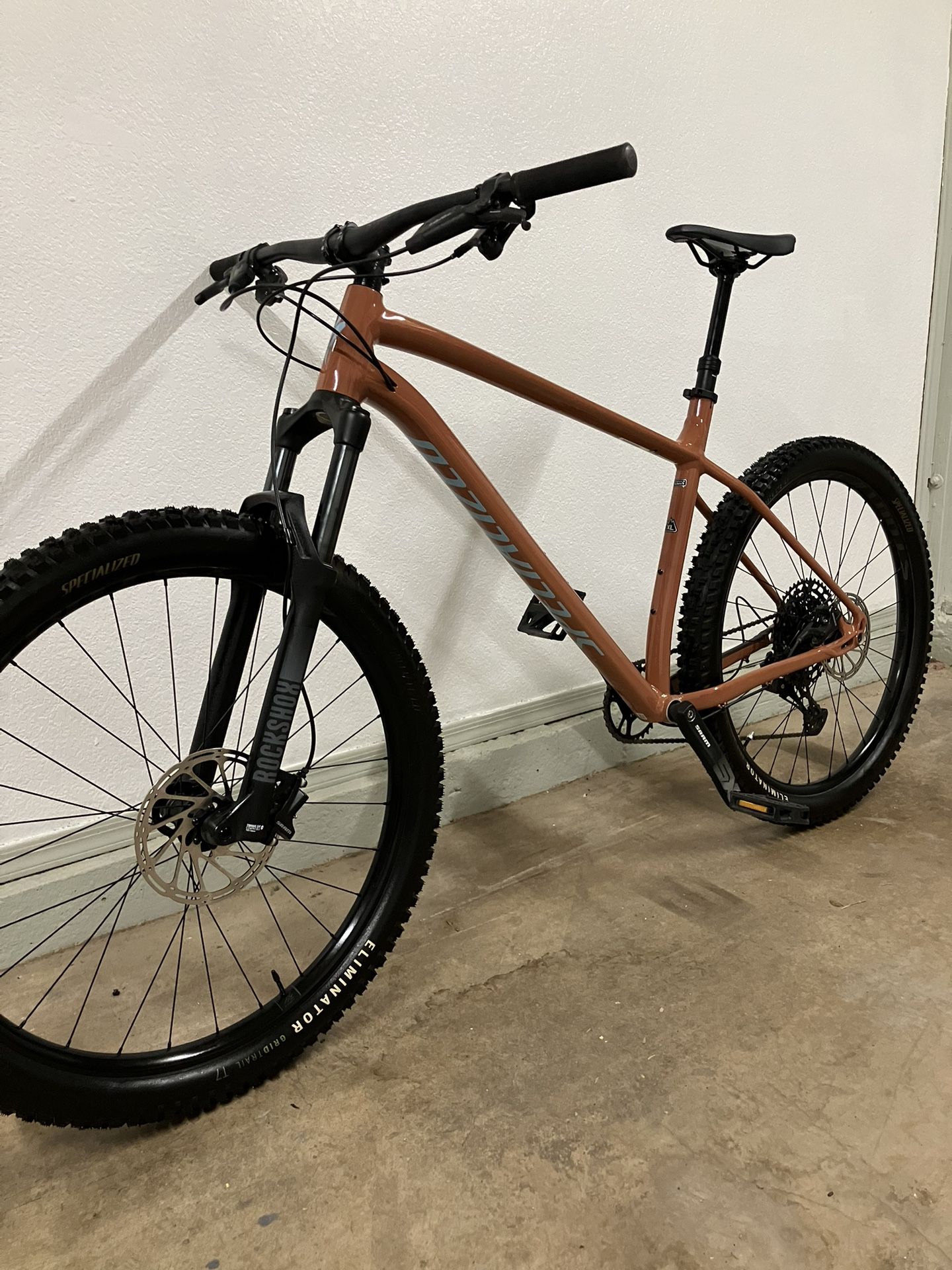 New bike purchased a year ago bike has been in garage since. Tubeless 27.5 tires, Dropper post, Rock Shox suspension, disk brakes, super lite bike.