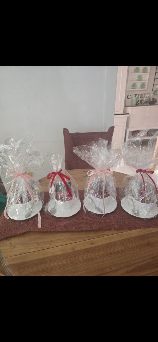 Milk glass tea cup and saucer with spoon, tea bag, candy, cookie and honey lollipop stick