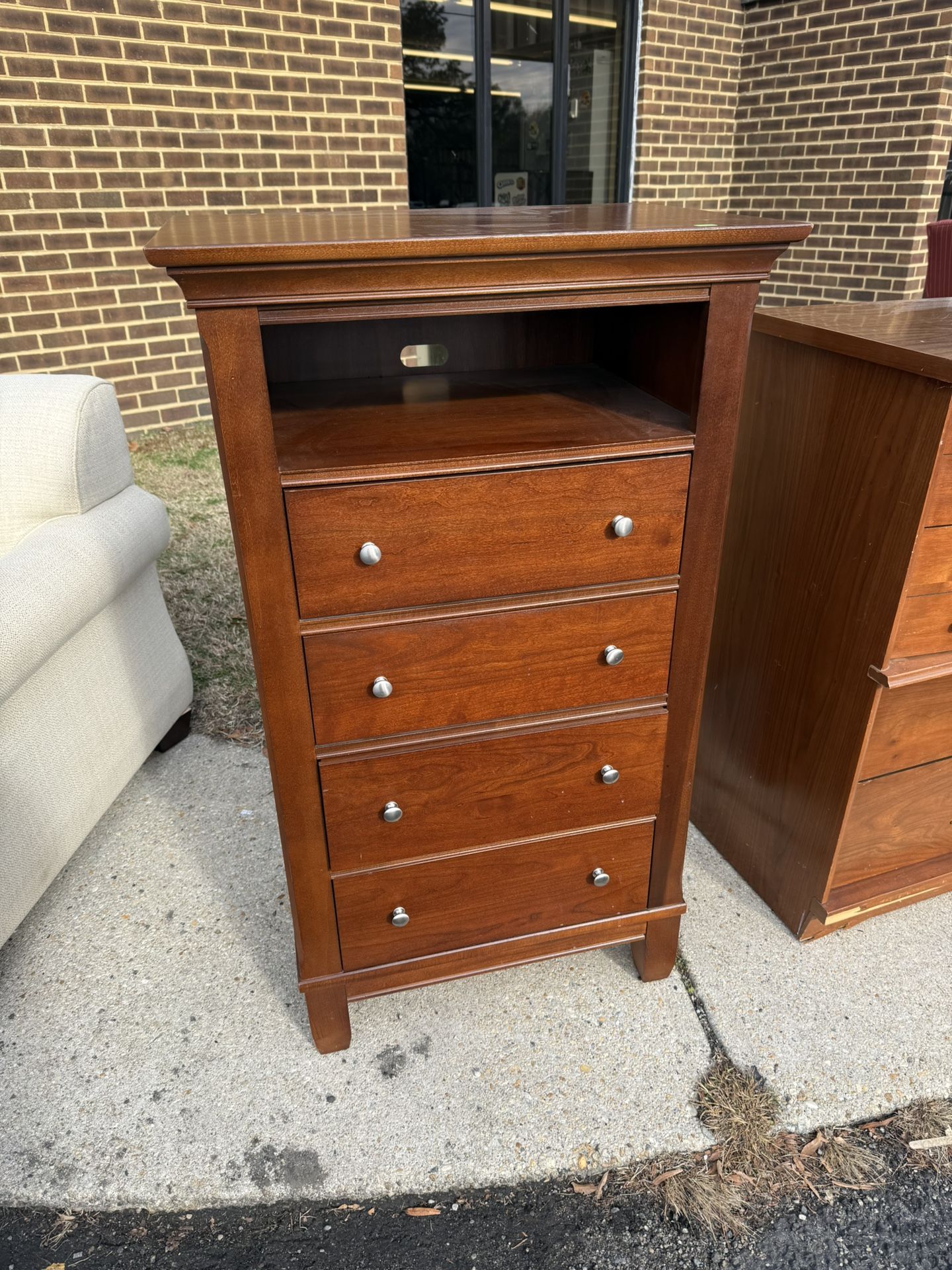 Small dresser the width is 27. The height is 47 1/2 in the depth is 19.