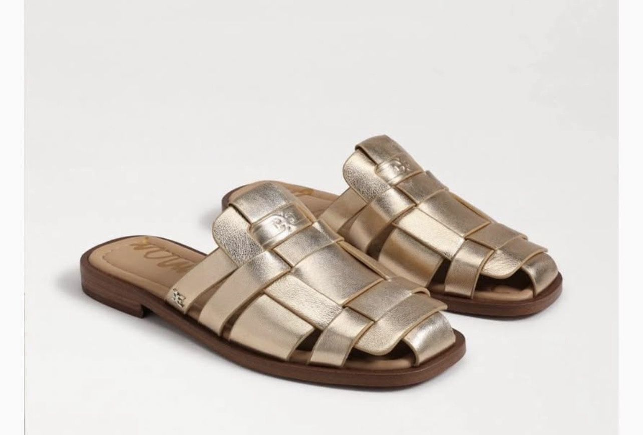 - Sam Edelman Dina Fisherman Leather Slip On Mule Sandals Condition: Excellent, preowned condition! Details: - Size: 7 - Color: Gold - Material: Leather - Features: Slip on, lightweight, logo, flats, closed-toe, low block heel, lightweight, comfort, breathable, outdoor, casual. - Finished in woven metallic leather, the Dina Fisherman sandal by Sam Edelman will complete any warm-weather look. Pair these chic slip-on mules with skirts, dresses, and denim. - Heel Height: 3/4" Retail $130 Asking $65