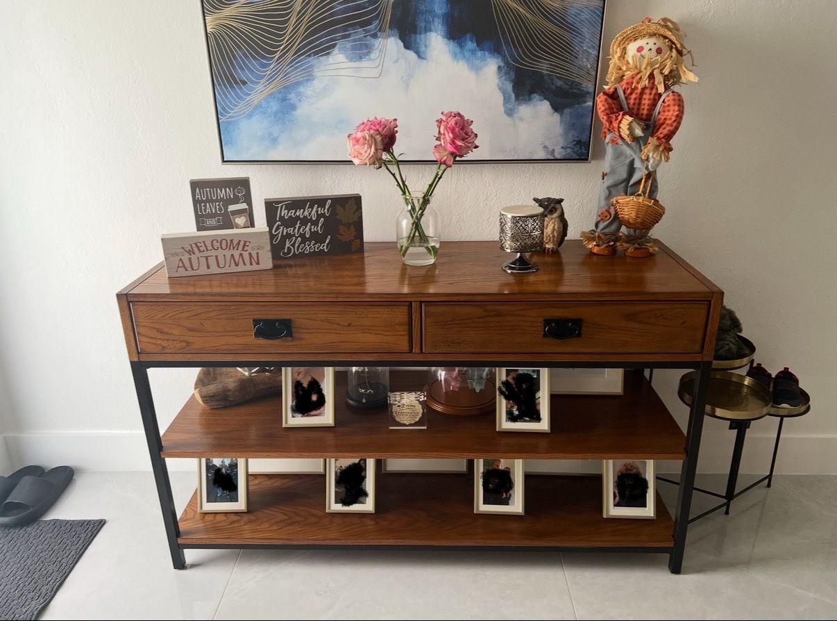 Solid wood and metal entry table with two large drawers. Very sturdy and heavy in great condition. 54 inches wide