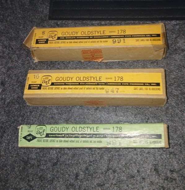 3) Unopened Boxes of Vintage Metal Letterpress Type American Founders Type 1) Box 8 Point Goudy OLDSTYLE Caps #178 1) Box 8 Point Goudy OLDSTYLE Lower Case #178 1) Box 10 Point Goudy OLDSTYLE Lower Case #178 $75.00 For all 3 Five Eight Six 7 Three Eight Eight 4 Two Five