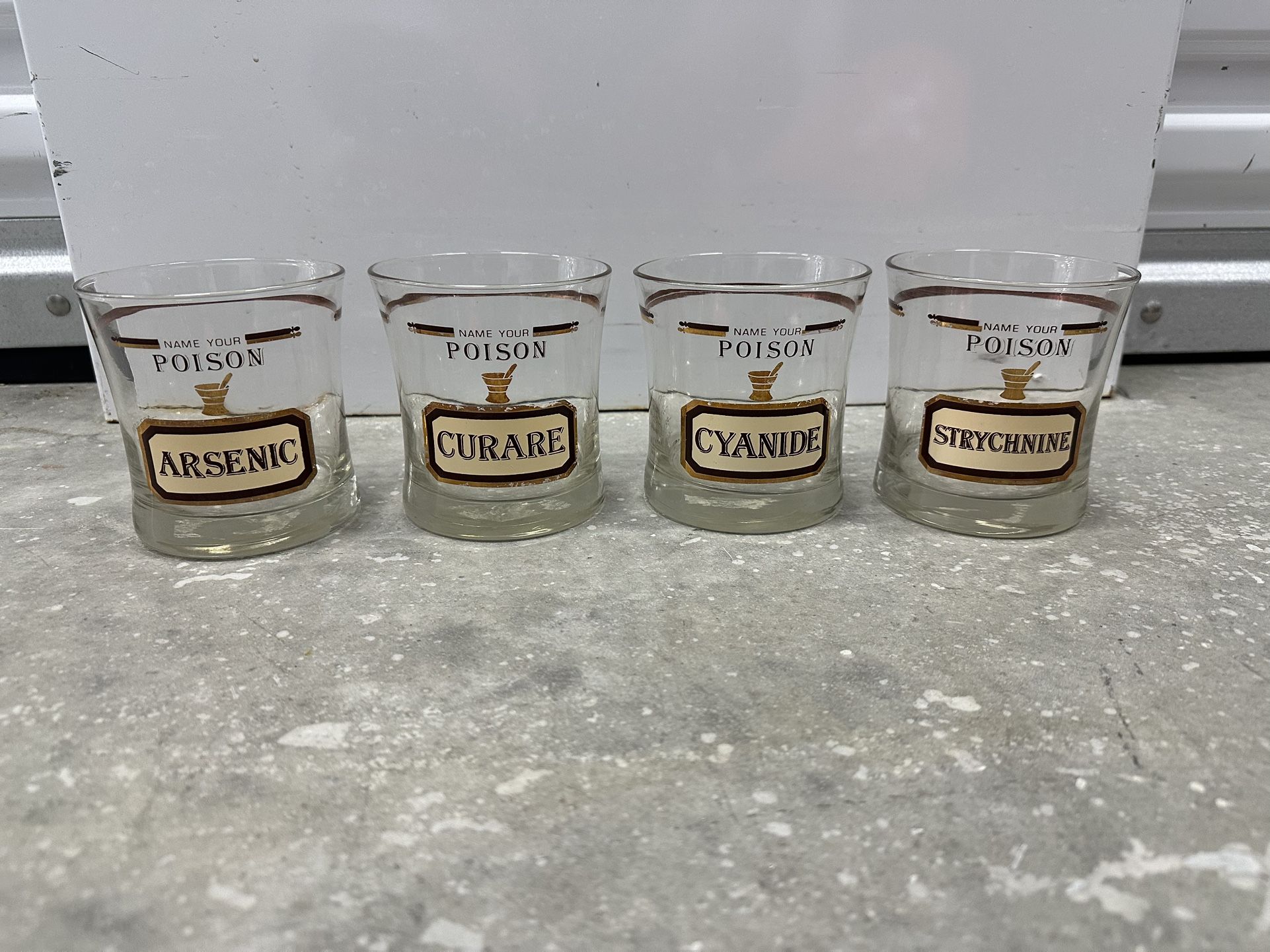 Vintage Set 4 NAME YOUR POISON Whiskey Glasses CERA / Neiman Marcus. Set of 4, rare.