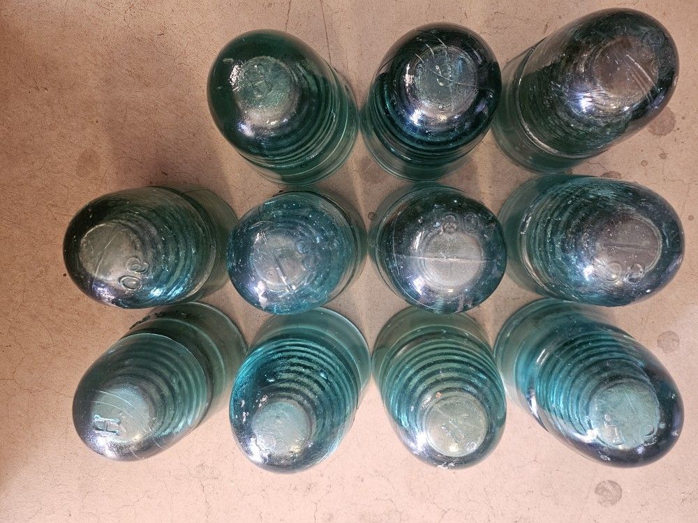 11 teal colored glass electrical insulators and 8 threaded wooden posts. Sold as entire lot.