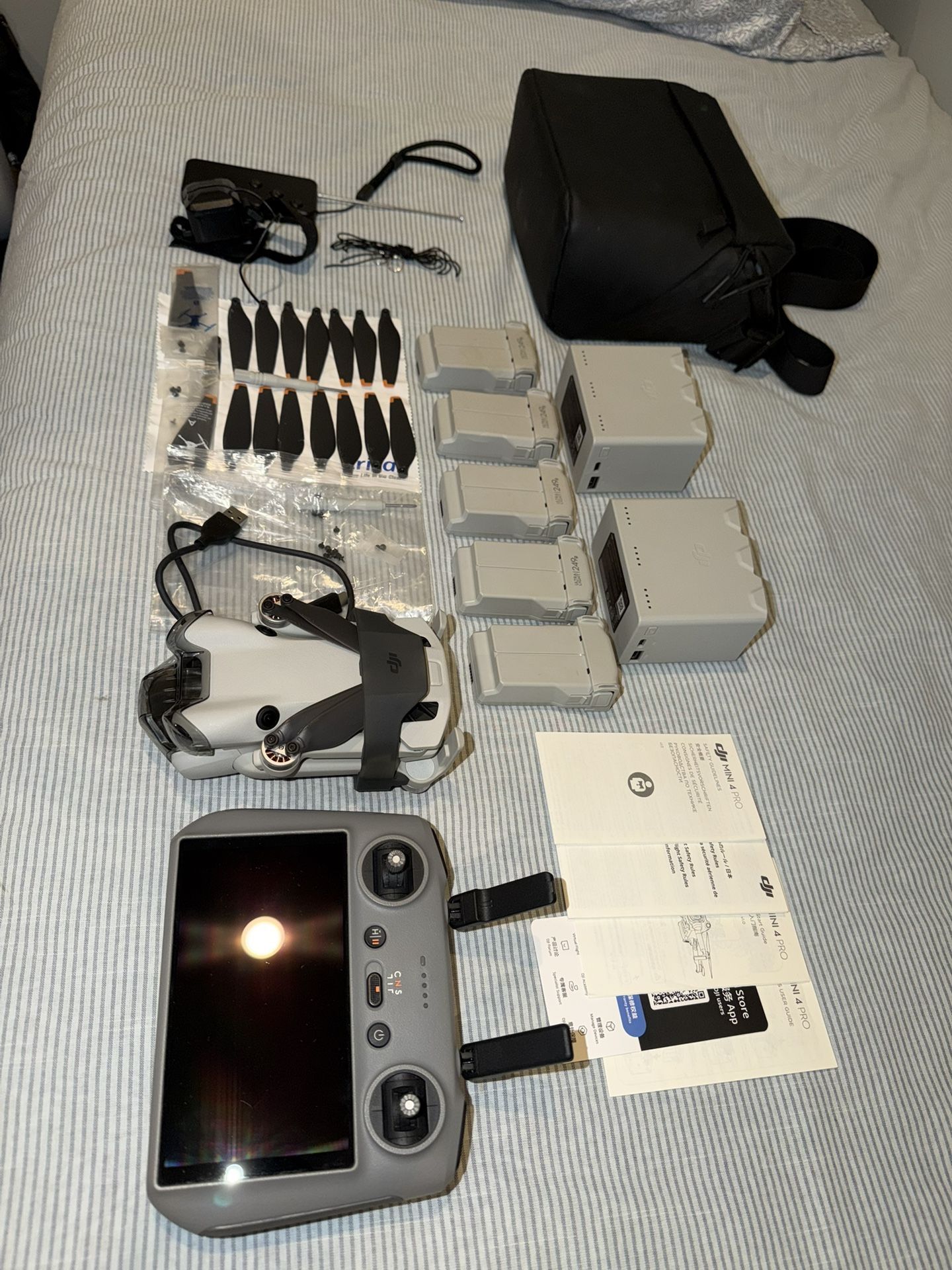 Includes- 1 - DJI MINI 4 PRO (with gimbal protector) 2 - DJI RC 2 (with built in screen) 3 - 4 249g Batteries and 1 extended 45 min flight time battery (5 batteries total) 4 - 2 charging stations (for the batteries) 5 - 18 extra propellers (with many screws) 6 - 2 Special screw drivers 7 - All the necessary charging wires 8 - 2 Cross body travel bag 9 - SanDisk Extreme Pro 128GB microSDXC UHS-I U3 A2 V30 Memory Card with Adapter 10 - A 3rd party Dropping Device and remote (that I used on my previous drone to go drone fishing and drop the bait) Everything works and is in great condition! Additionally I still have 3 more replacements with DJI Care Refresh (drone insurance with DJI) so if your drone crashes you can call me and for $100 I can get you a brand new replacement! I think I have a little more than a year left to the warranty. (We can exchange numbers by purchase!)