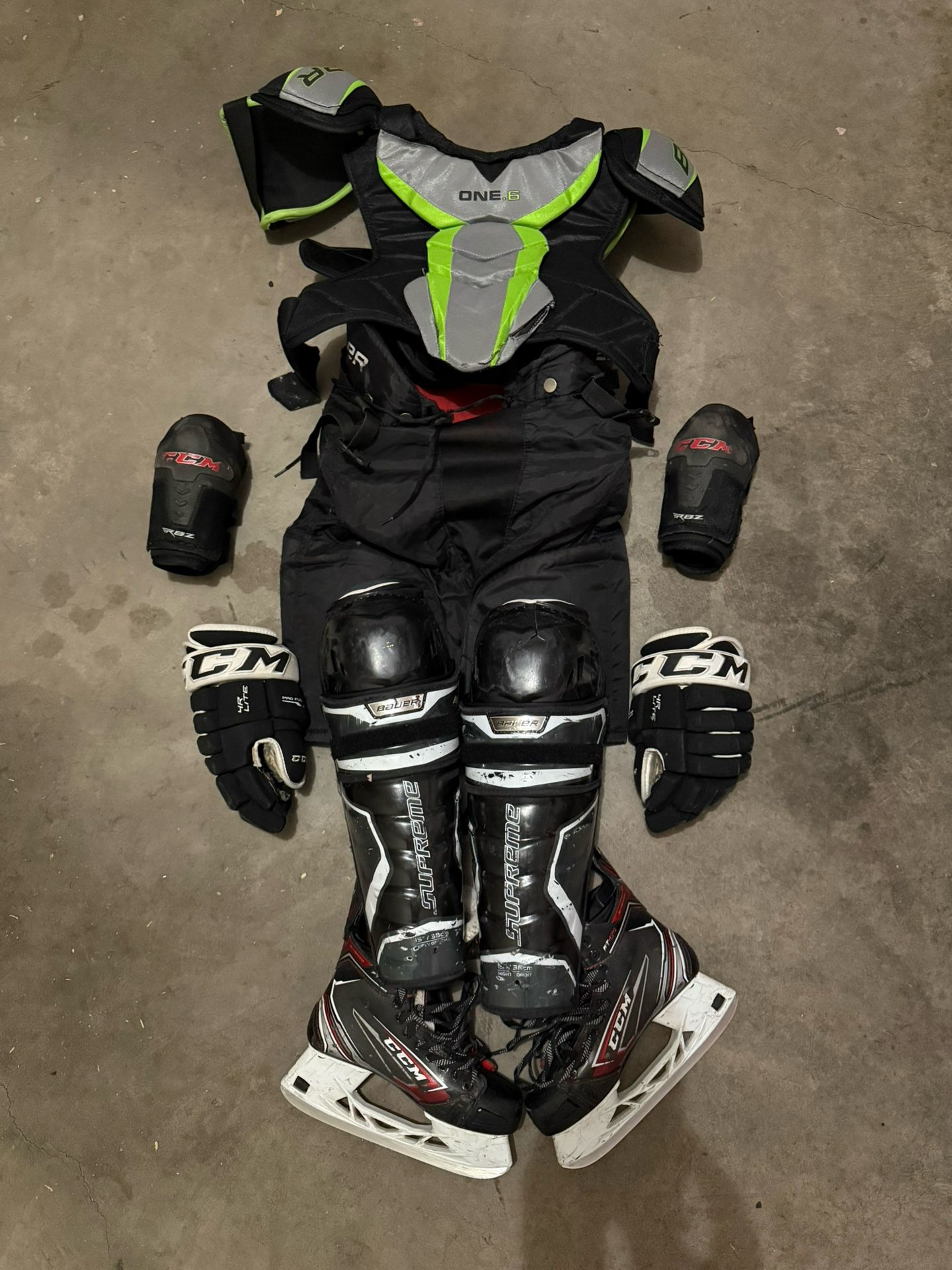 Great for someone just starting out in hockey! Sold as a set and as-is. Bag Brand New TronX hockey travel bag. Slots for skates on outer part of bag. Skates Adult Size 7 - CCM FT470 Skates. Tendon guard is slightly cracking and held by tape. Gloves 13” Adult CCM hockey Gloves. Very worn in the finger lining. Breezers Adult Medium adult hockey breezers. The belt has a half broken clip but still locks. Elbows CCM Adult large hockey elbow guards. Shoulder Pads Adult Large Bauer one.6 shoulder pads Shin Pads Adult - 15” Bauer Supreme Shin pads. Slight Crack in the right knee pad but still protects.