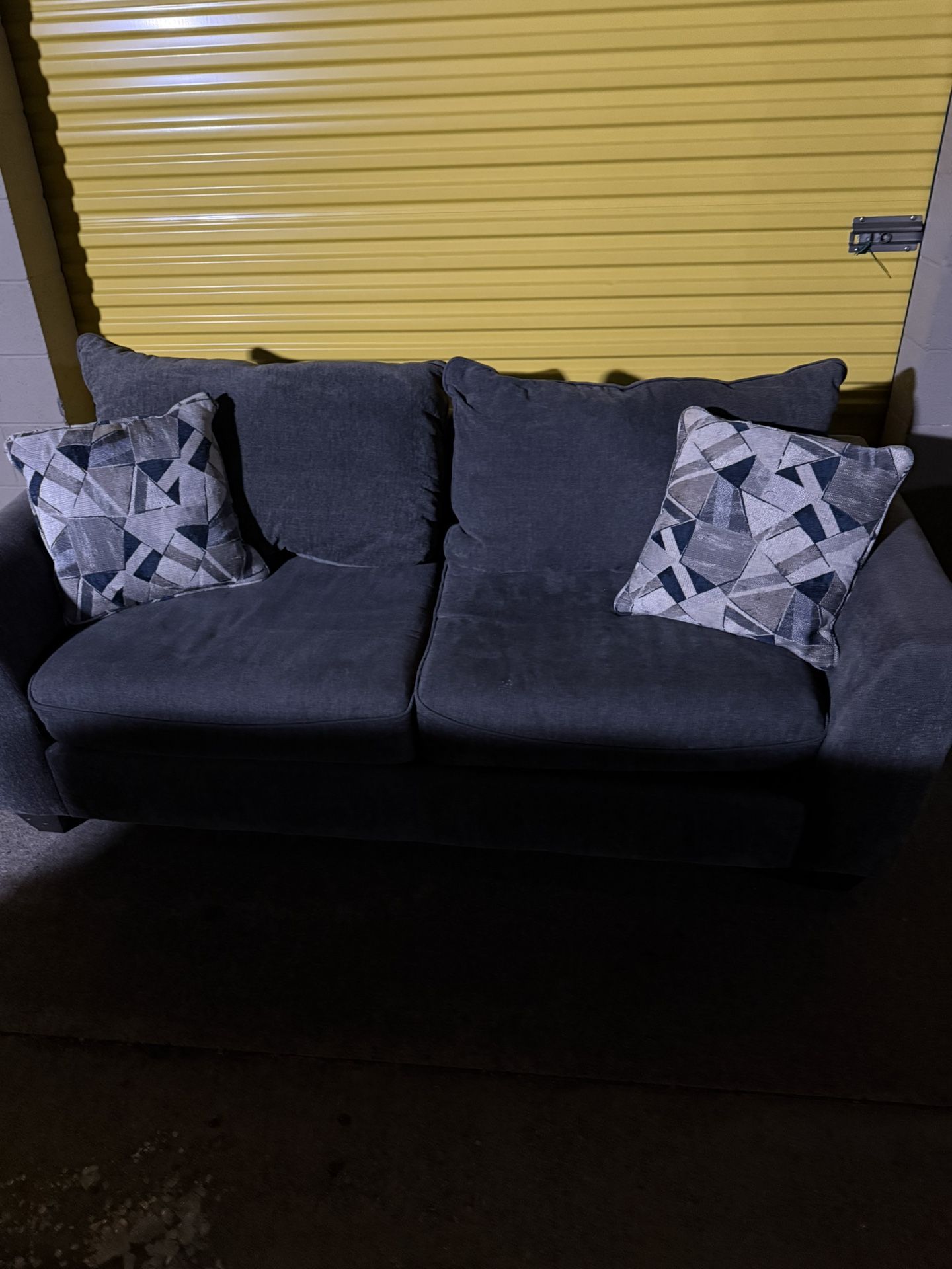 This is a grey loveseat. It comes with throw pillows and very comfortable. No issues. No pets. No smoke.