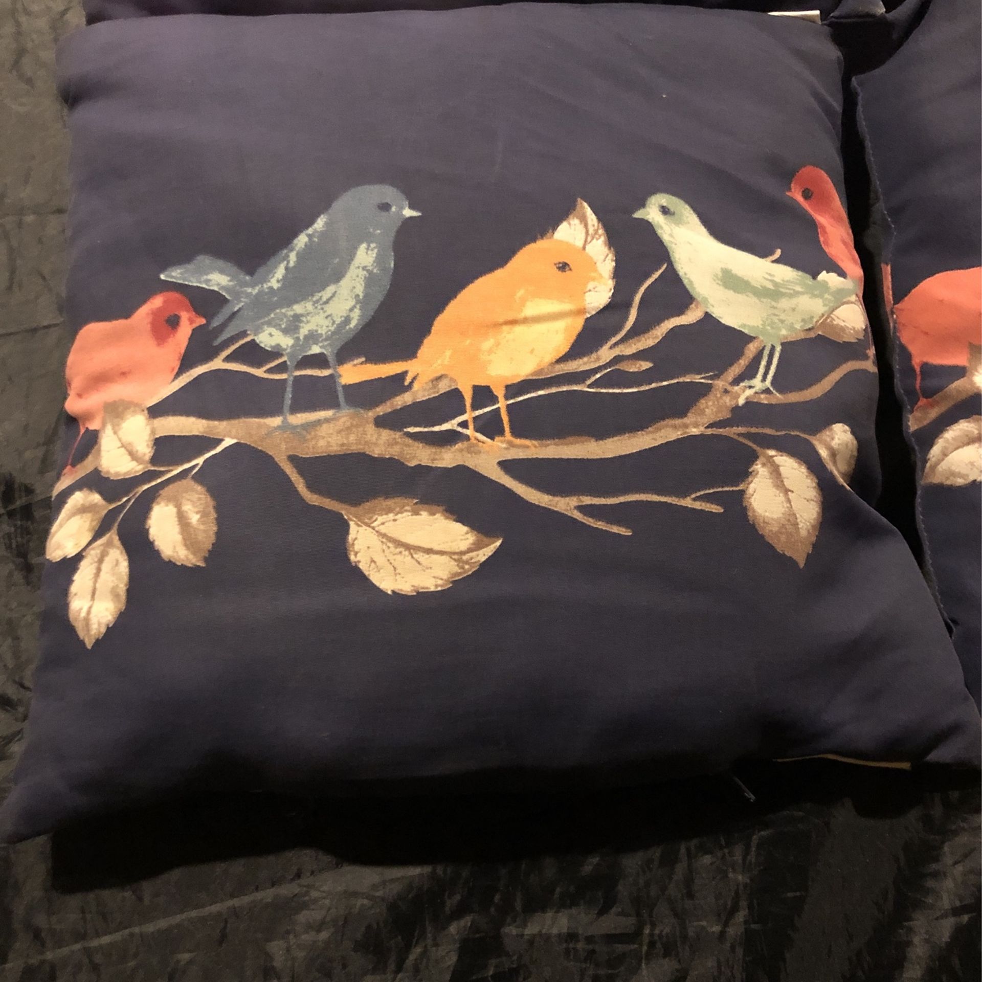 Patio / Couch throw pillows. Dark blue pillows with baby birds on them.