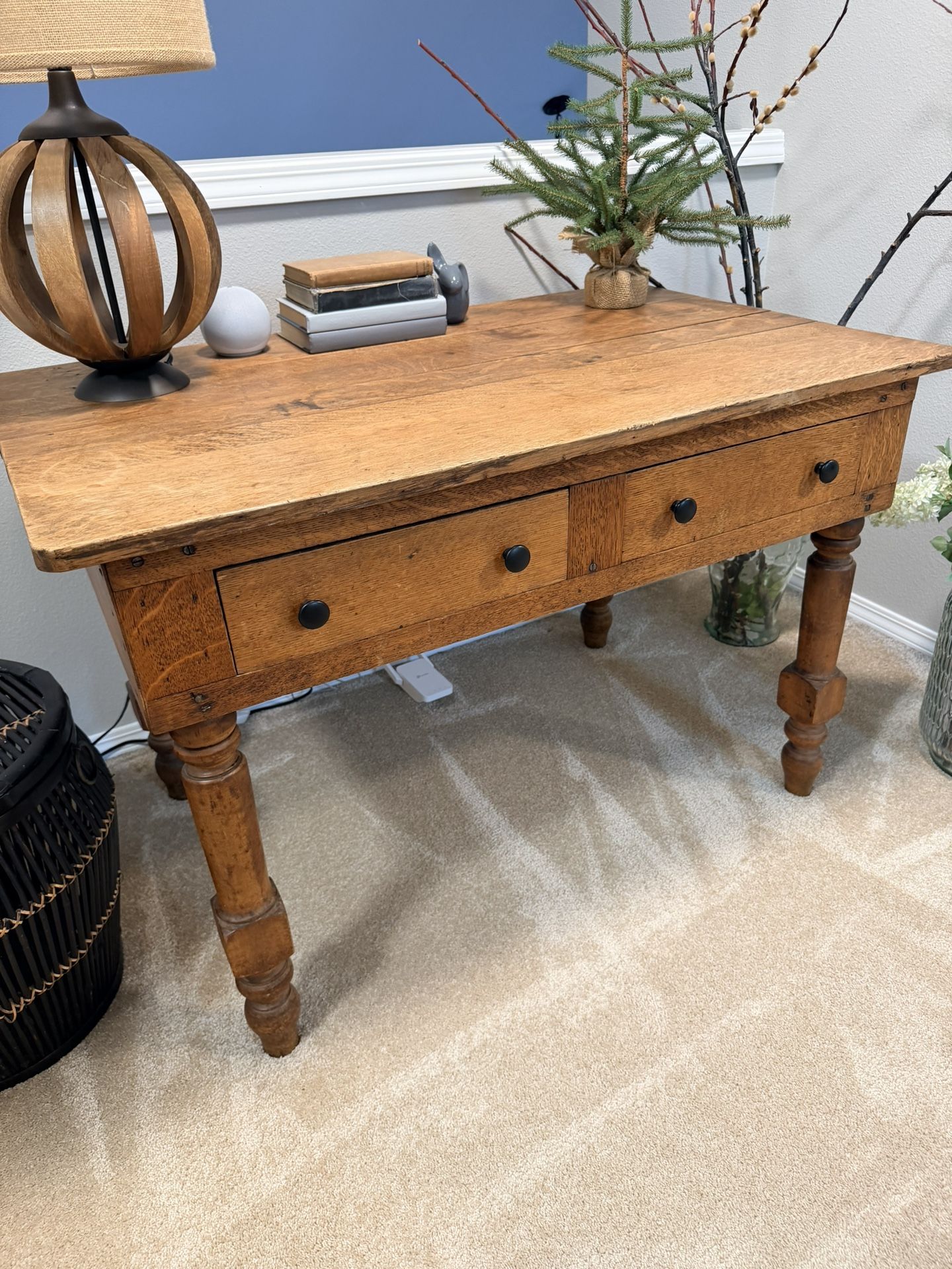Wood. Legs were added from a different piece of furniture. Table looks antique. All repurposed I think. The table is too short to be a desk. 27.5 “ deep x 29” high x 44” wide. 20 3/4” from the ground to the bottom of table.