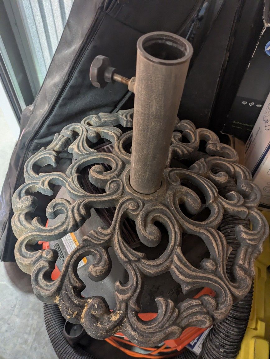 metal outdoor umbrella stand for a table with an umbrella hole or just to hold down your umbrella for shade out doors. it weighs approximately 55 lbs, based off me trying to lift it. i have no other way to weigh it.