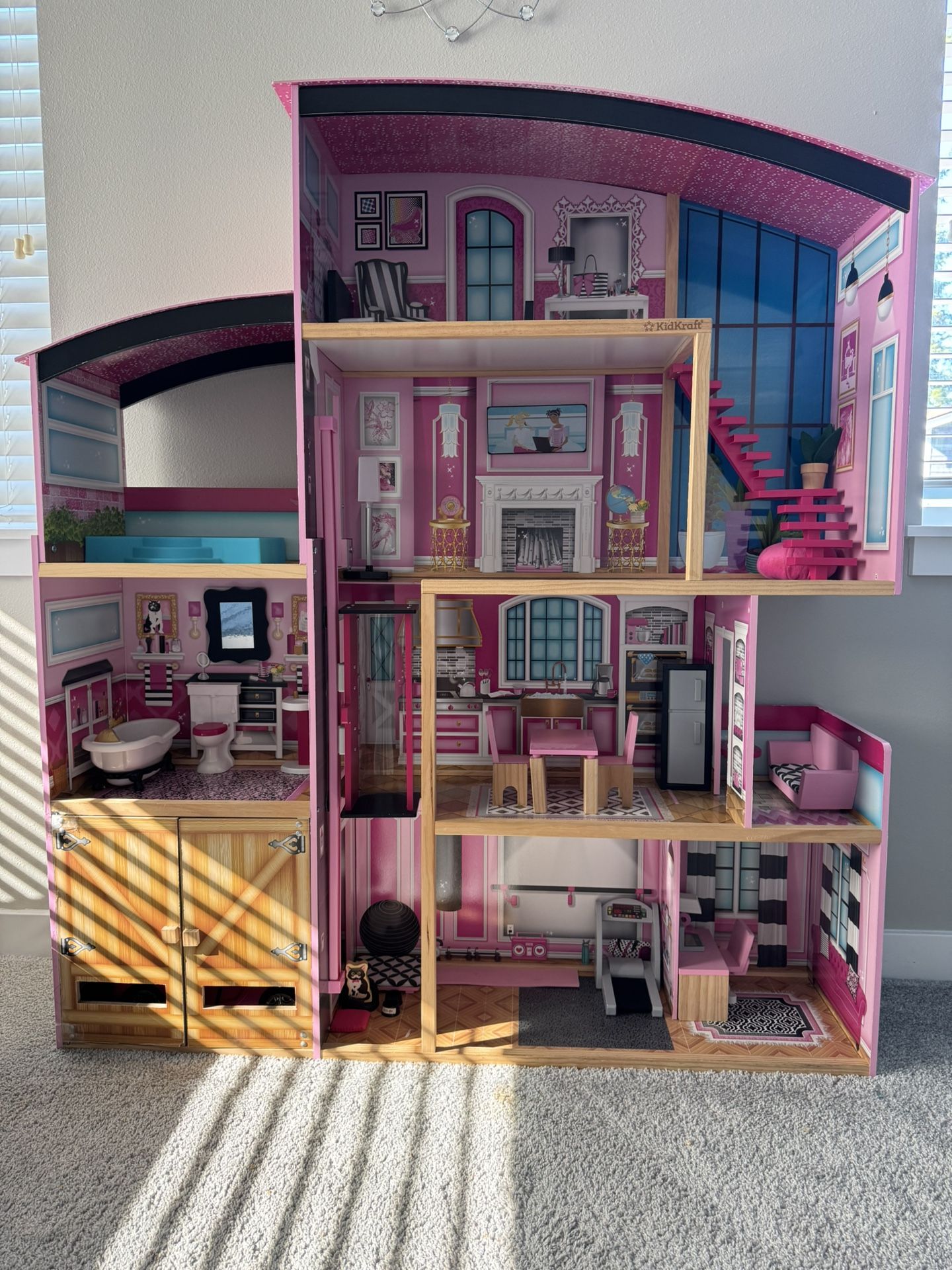 The KidKraft Shimmer Mansion over-four-foot-tall indoor dollhouse for kids to help spark creativity and learning. Working elevator glides up three stories. This indoor dollhouse has working lights and multiple features for dolls, including a flushing toilet, a framed mirror on the wall, a stylish pink elevator, a balcony spa, a modern staircase, a towering doll bedroom loft, hand-painted wood furniture and accessories, a workout room, and more. Your little ones will love the imaginative play and learning offered by the KidKraft Shimmer Mansion Wooden Dollhouse!