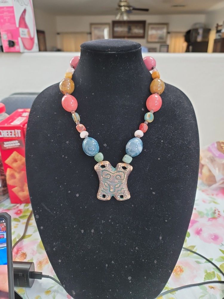 Some real and synthetic stones mixed with heritage style necklace as pictured.
